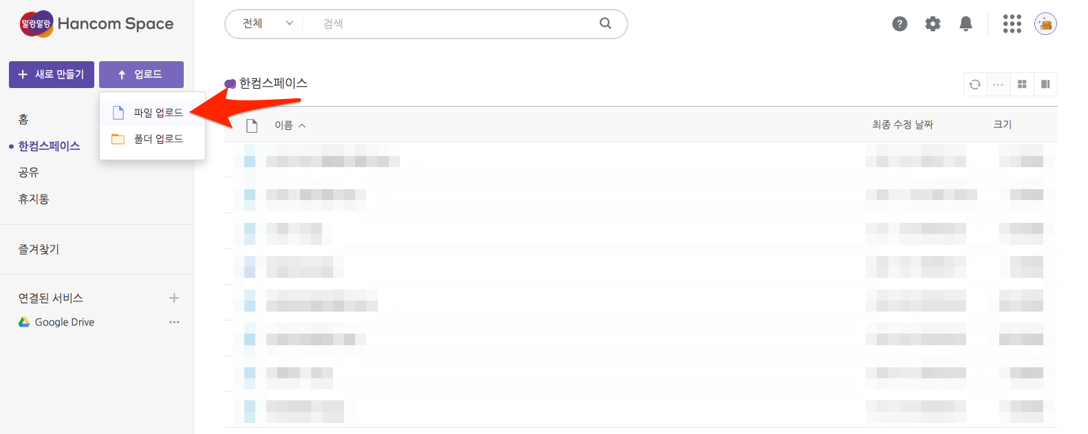 왼쪽 상단 [업로드] 버튼을 클릭하시면 팝업 메뉴가 나옵니다. [파일 업로드]를 선택합니다.