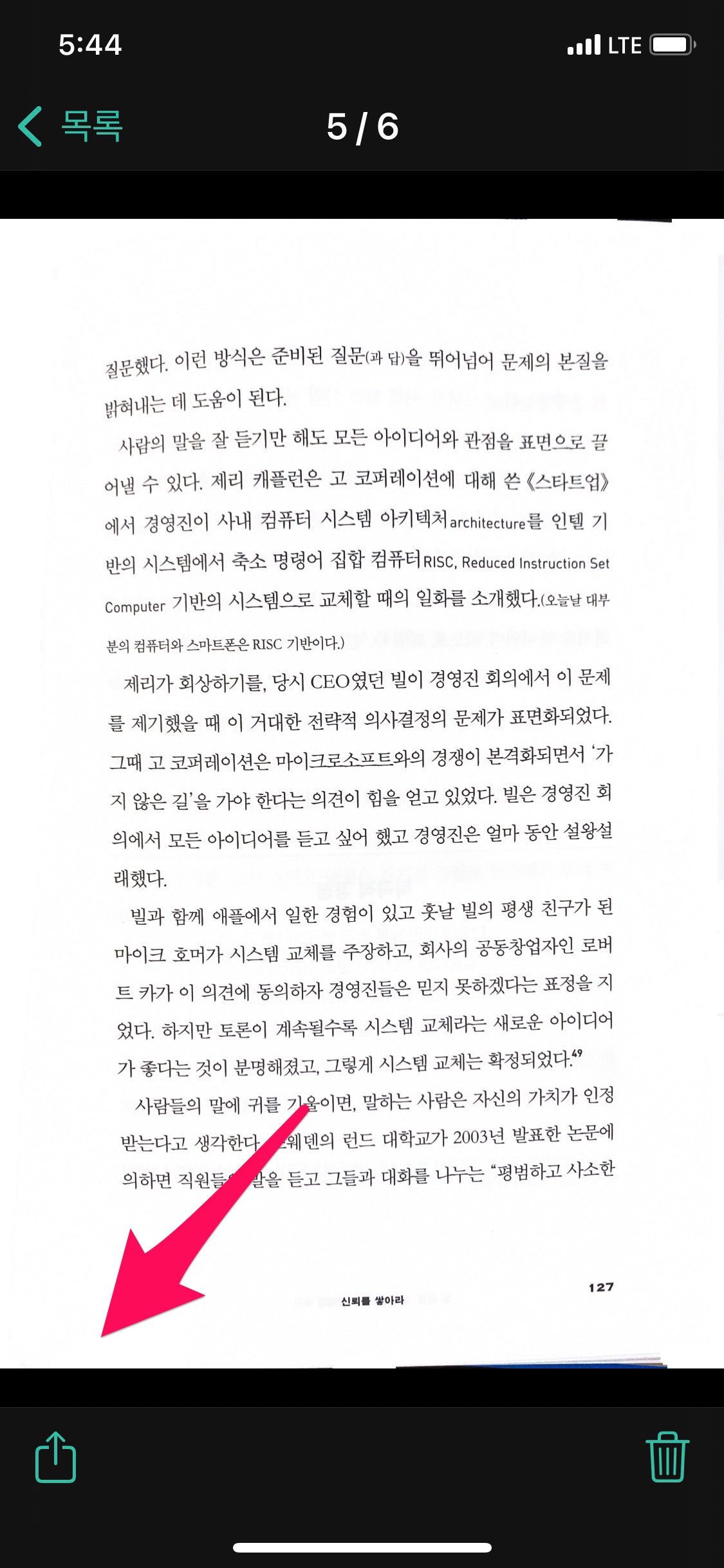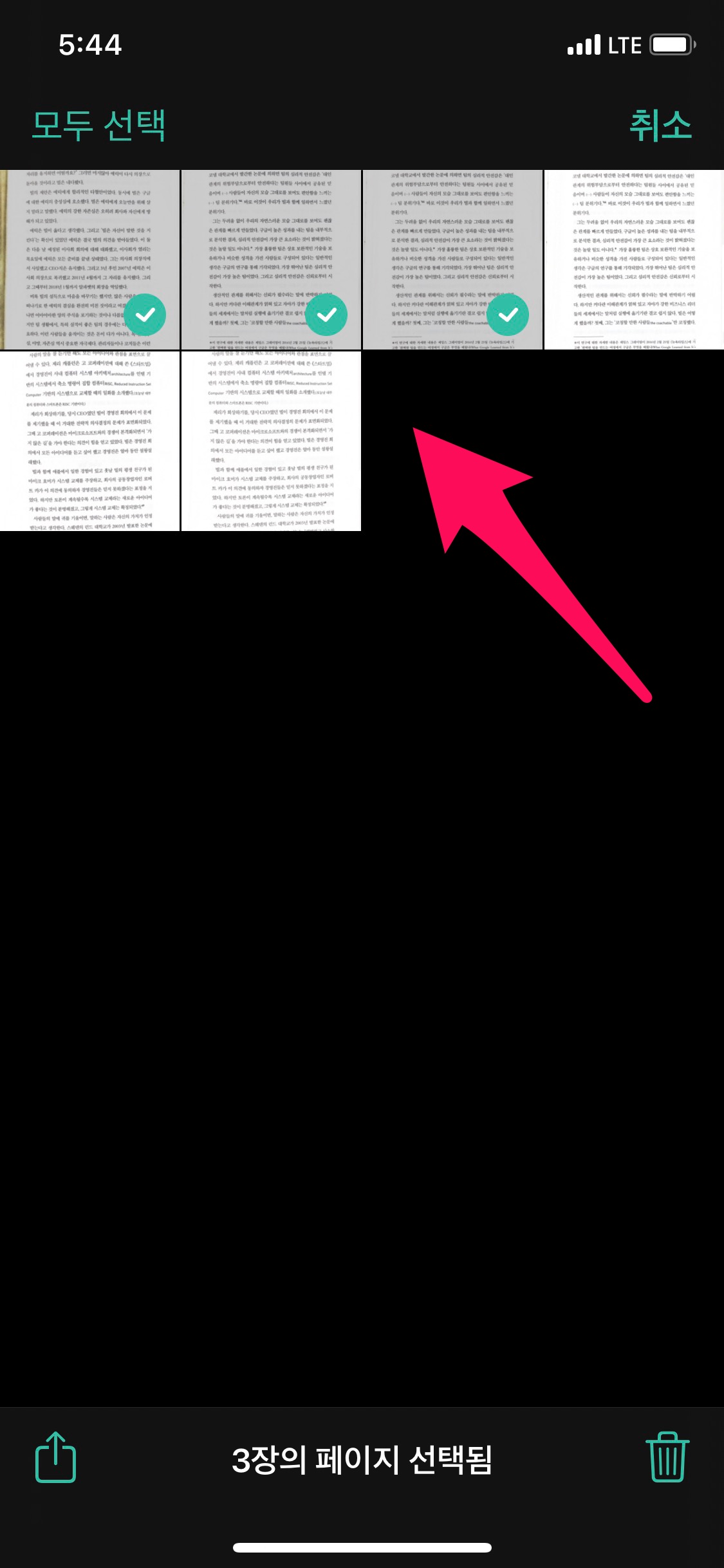 촬영한 페이지를 1장만 선택할 수 있고 여러 장을 선택할 수 있습니다. 지금은 도서의 일정 페이지를 촬영한 사진들을 모두 선택하고 하단 왼쪽에 있는 공유 버튼을 선택합니다.