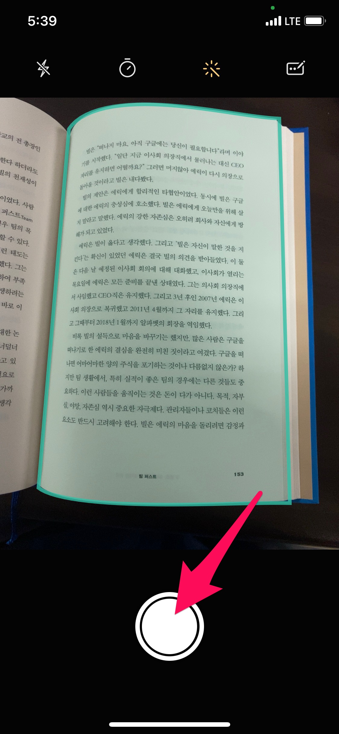 우선 스캔하고 싶은 도서를 펼친 후에 카메라를 갖다 대면 자동으로 페이지 굴곡까지 인식하여 촬영이 가능합니다.