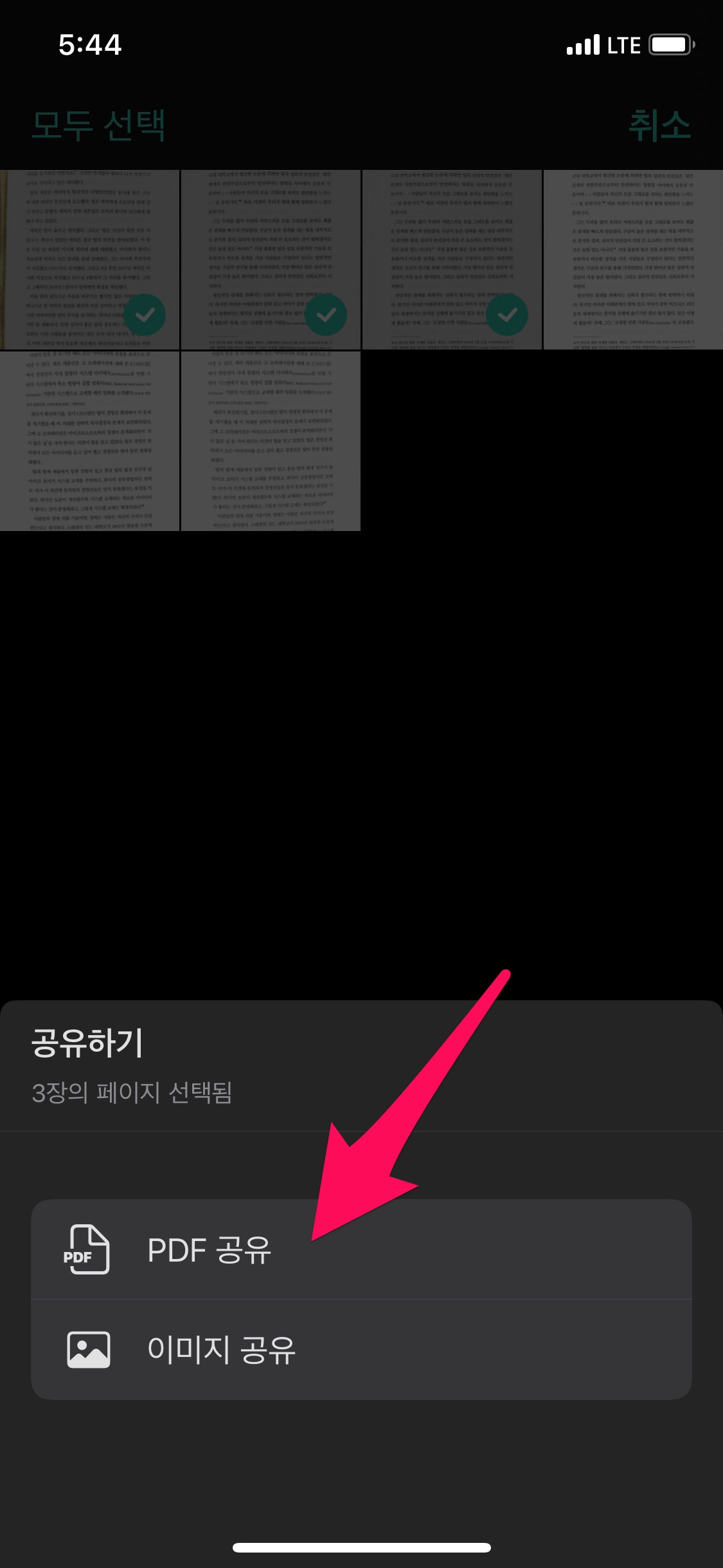 공유하기에서 PDF 공유와 이미지 공유의 차이는 PDF는 여러 장을 선택해도 오직 1장의 PDF가 만들어지고 이미지 공유는 각각 1장씩 이미지가 생성이 됩니다. 이번에는 PDF 공유를 선택합니다.