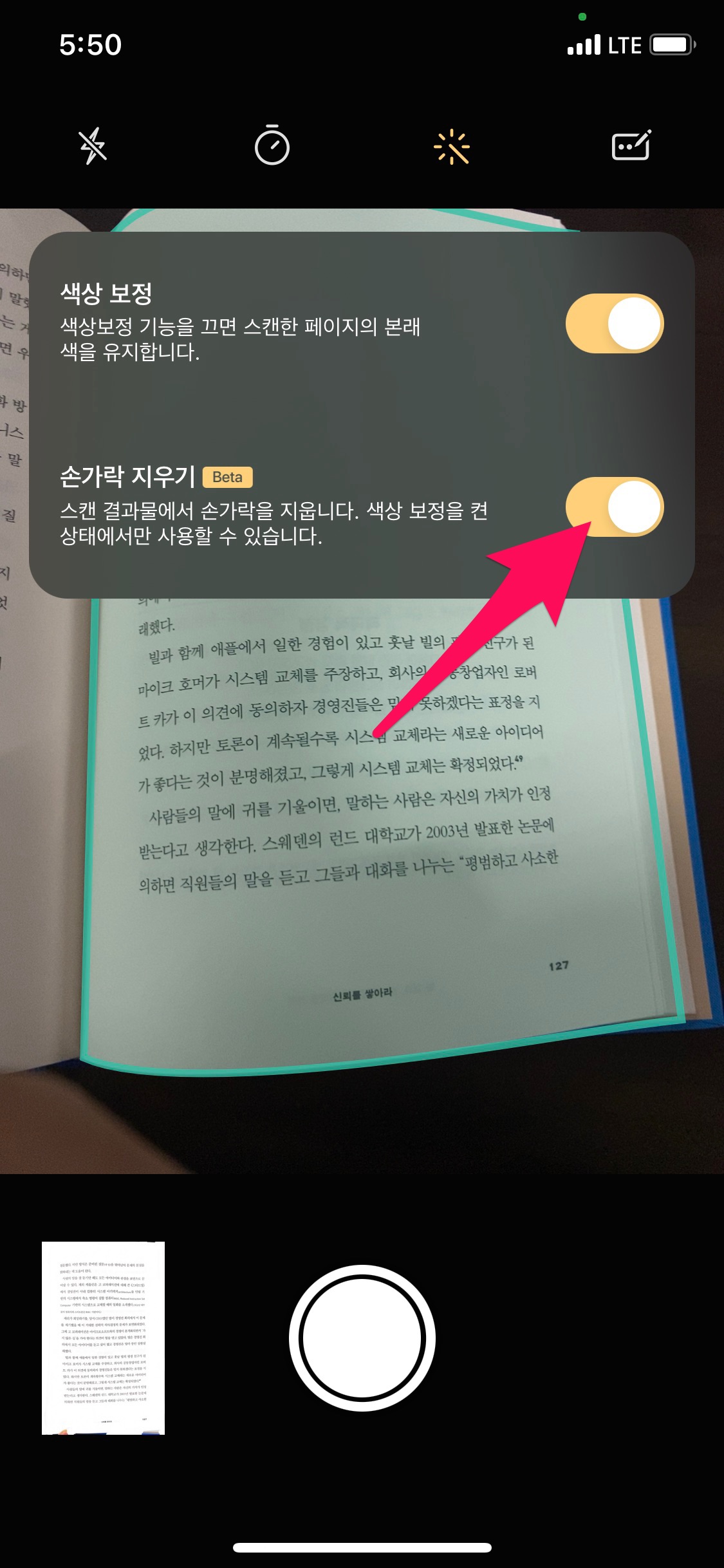 색상 보정은 기본 옵션으로 선택되어 있고 손가락 지우기는 선택이 안되어 있기에 손가락 지우기를 선택하면 스캔 결과물에서 손가락을 인식한 후에 손가락을 지워줍니다.
