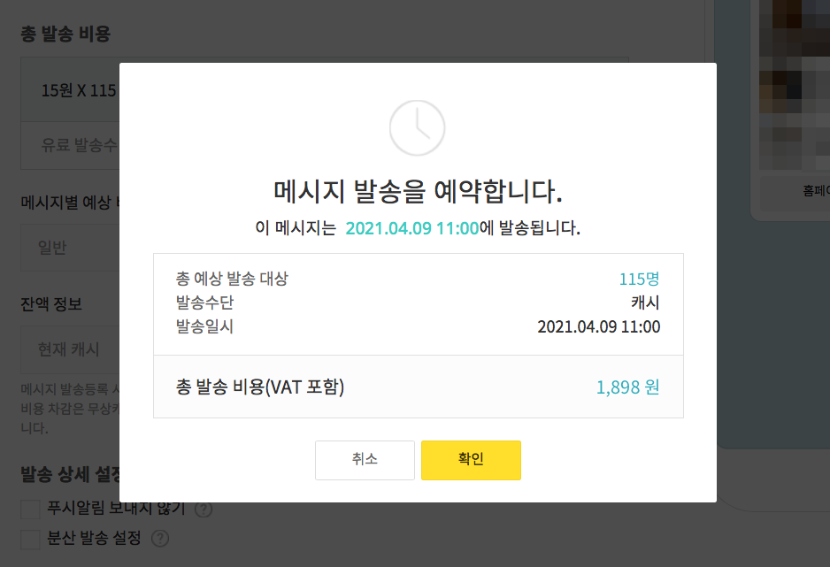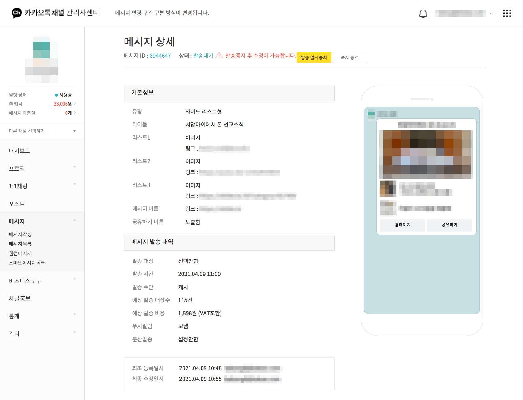 바로 발송해도 되지만 테스트 발송을 이용해서 카카오톡에 어떻게 발송되는 테스트 합니다.