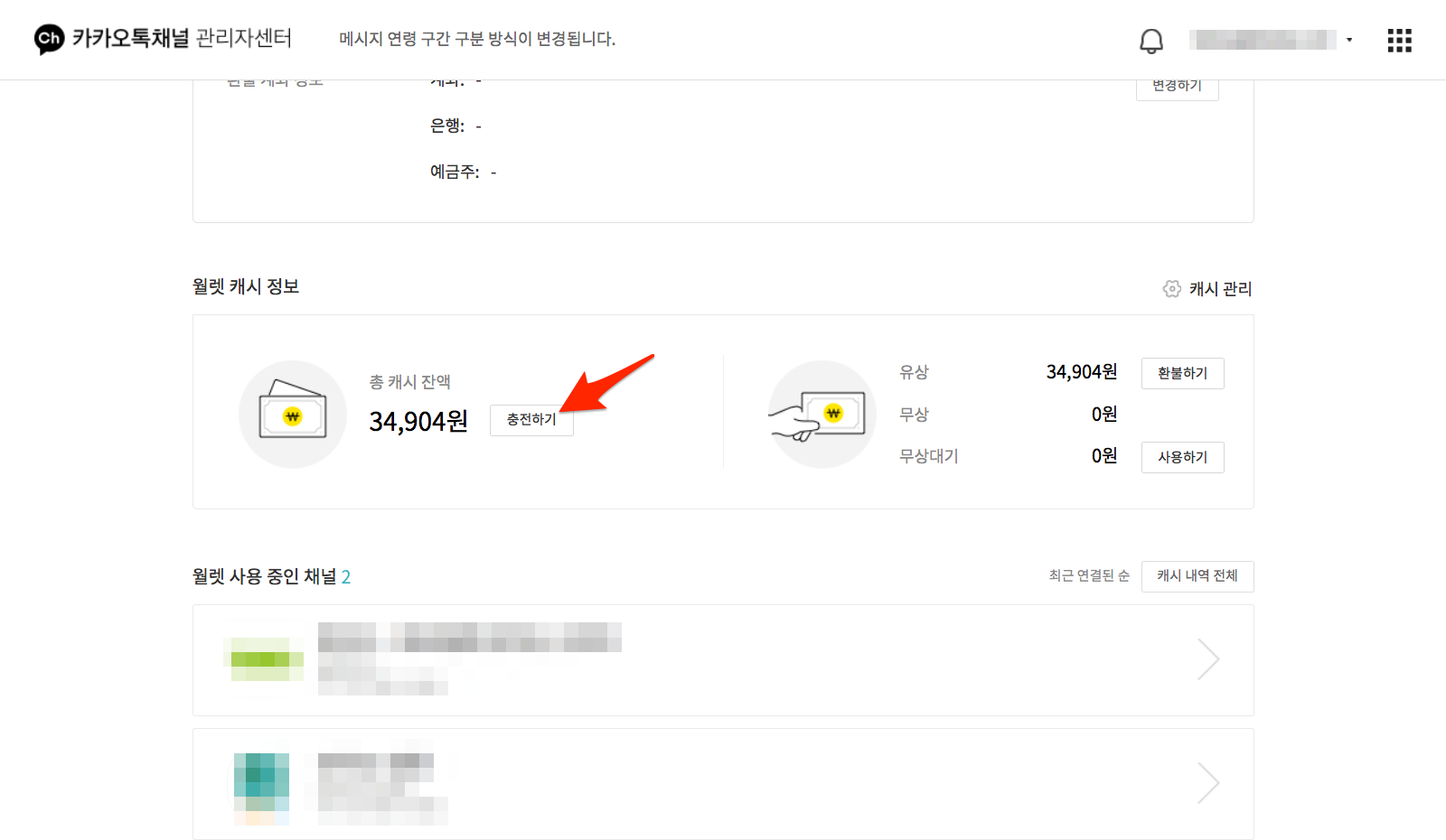 채널 대시보드로 들어오면 우선 캐시 충전을 합니다.