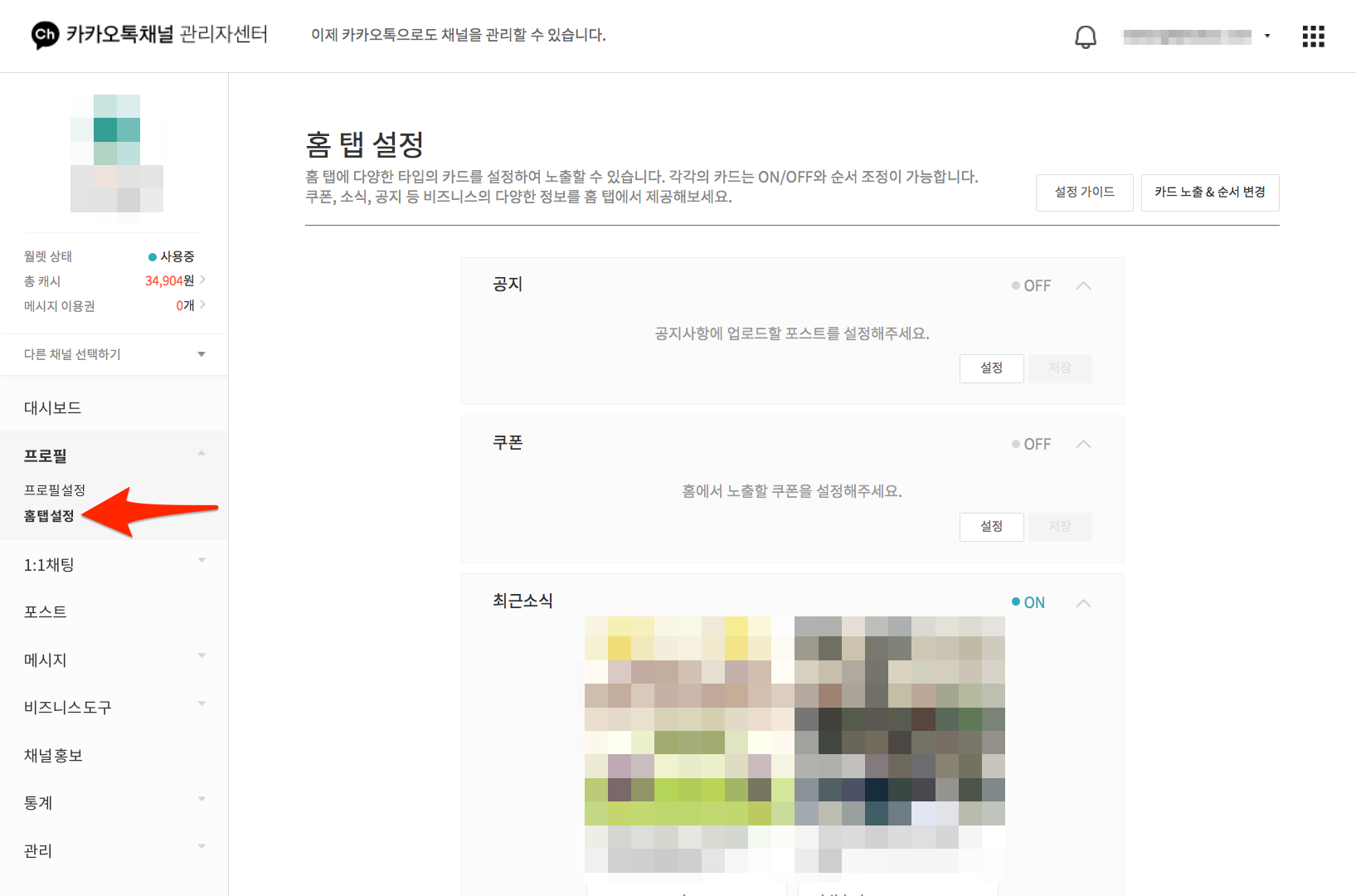 홈 탭 설정은 홈, 일명 홈페이지에서 구성하는 레이아웃을 설정합니다.