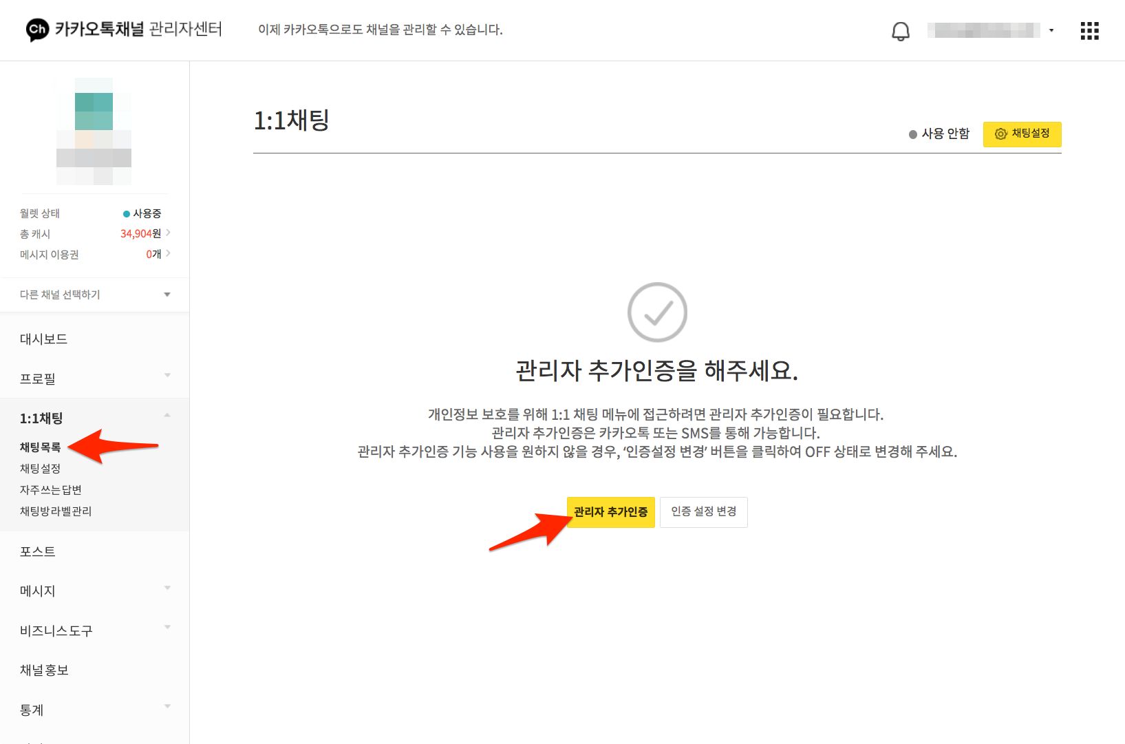 관리자 인증을 통해서 1:1 채팅이 가능한 인증을 진행하시면 됩니다.