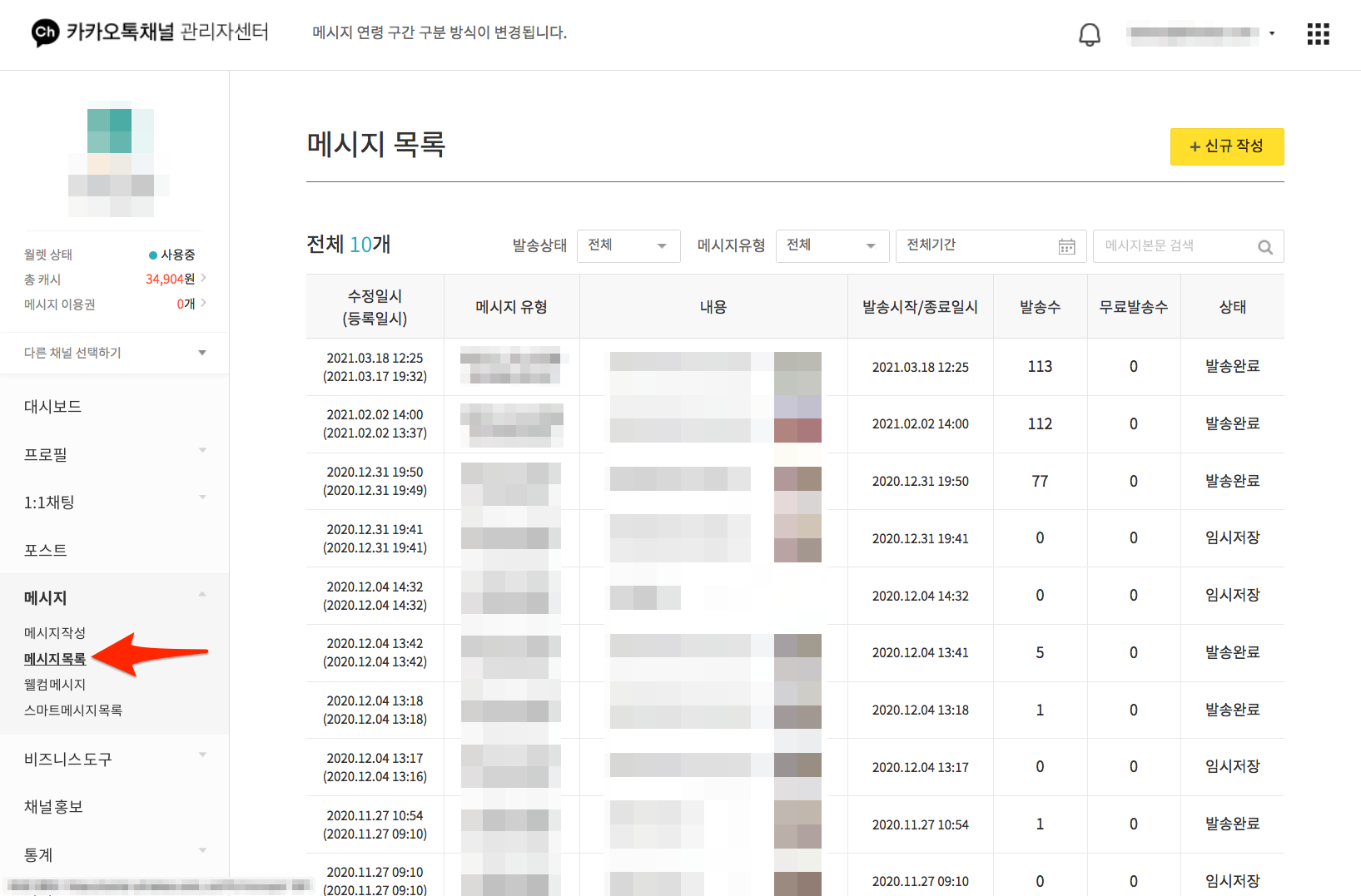 메시지목록에서는 그동안 발송한 메시지들을 확인할 수 있습니다.