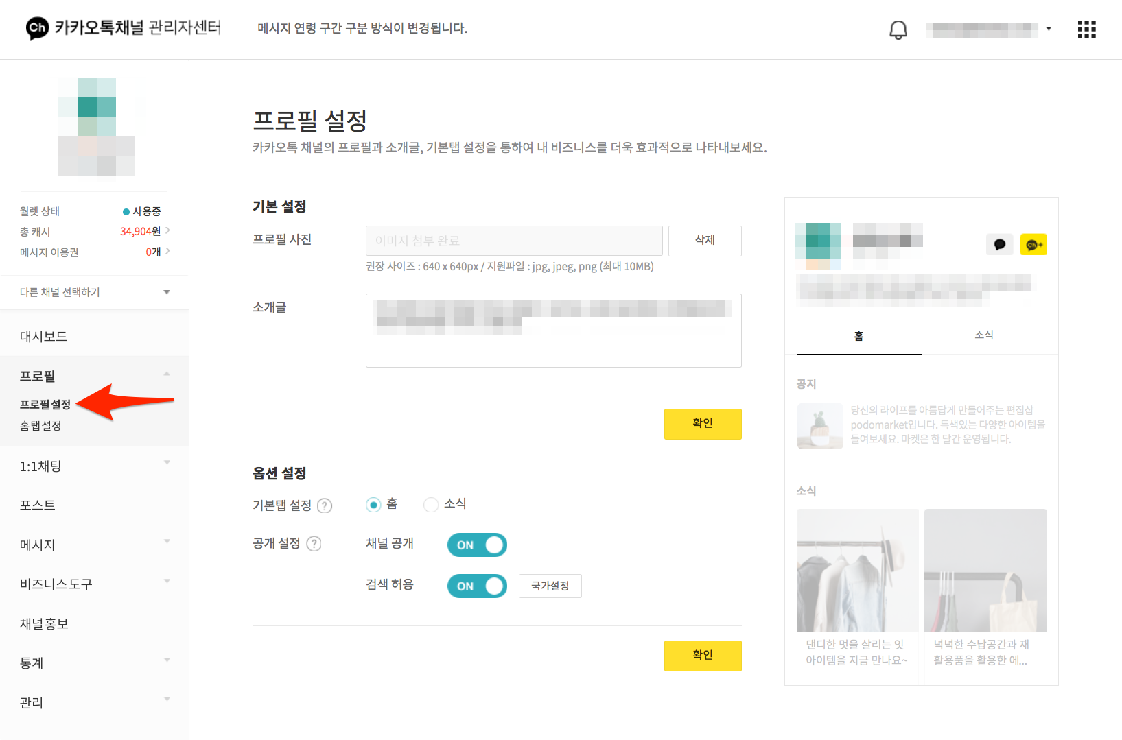 상세설정에서는 채널 이름, 아이디, 주소 등을 확인할 수 있고 채널 삭제도 가능합니다.