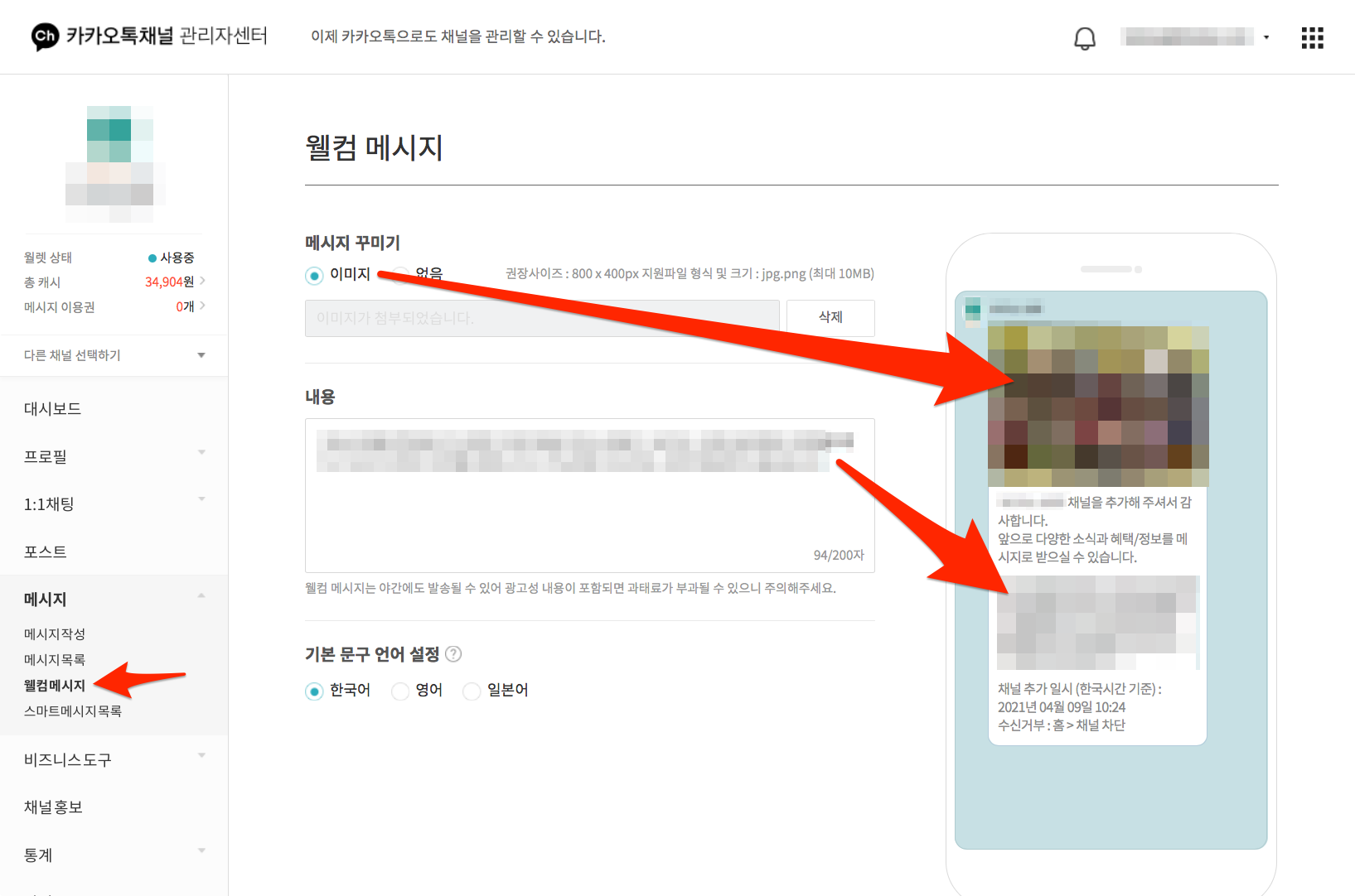 채널홍보를 통해서 채널 홈에 들어와 가입을 하면 자동으로 받게 되는 웰컴메시지를 꾸밀 수 있습니다.