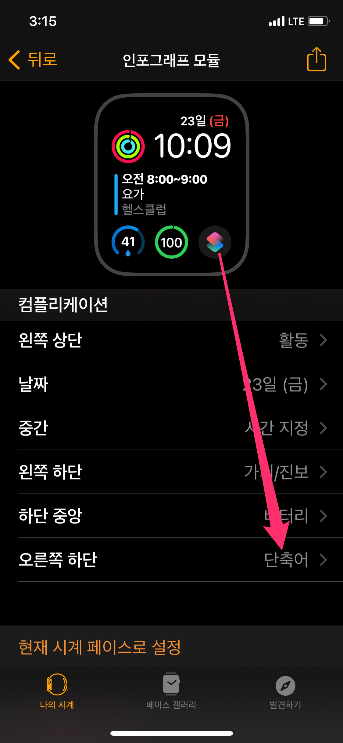 아이폰 Watch 앱에 접속하여 나의 페이스를 선택합니다. 저는 인포그래프 모듈을 선택했습니다.