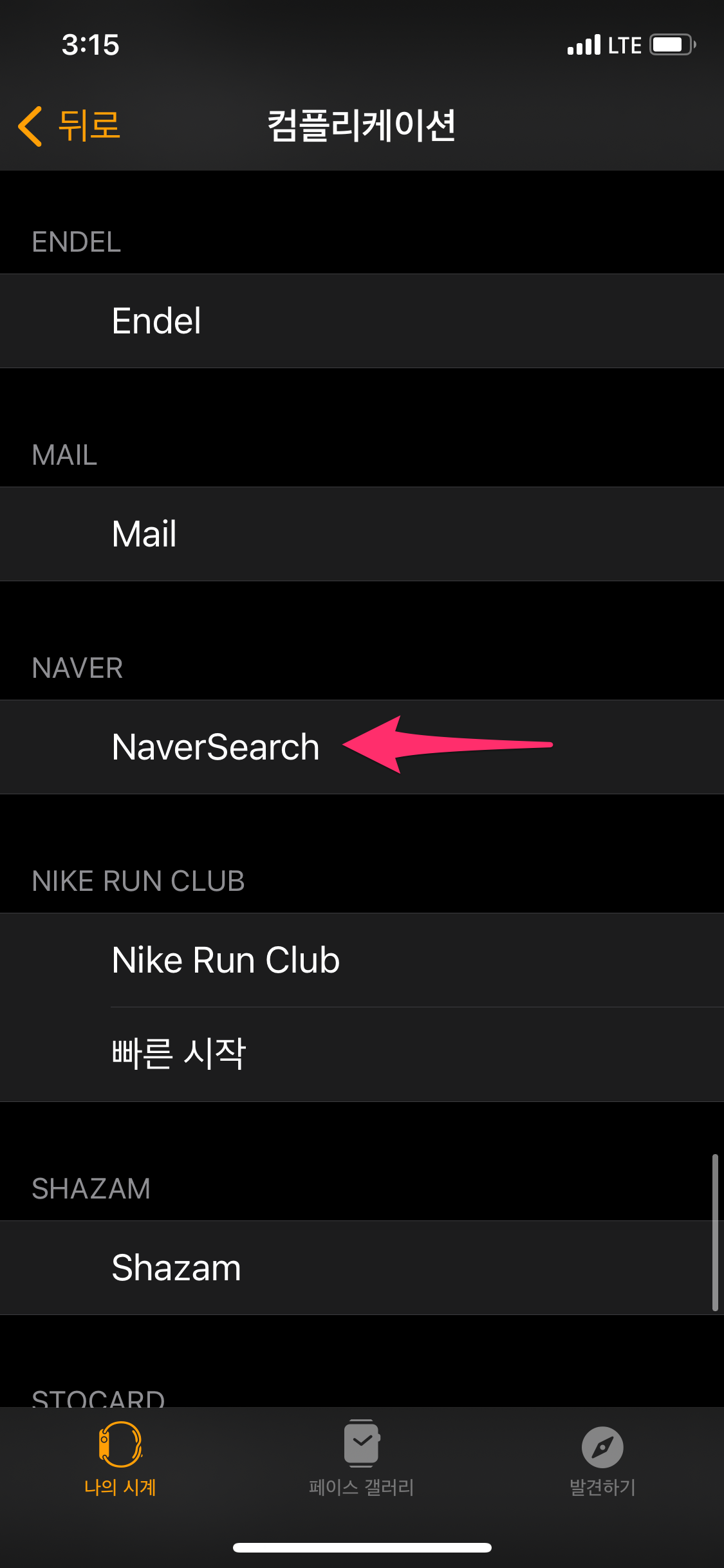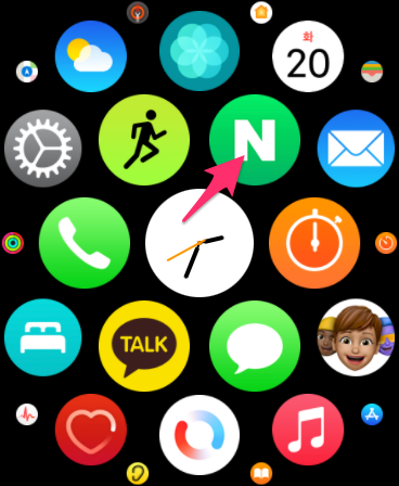 이제 애플워치 화면에서 오른쪽 하단에 있는 NaverSearch를 선택하면 바로 네이버 앱이 실행됩니다.