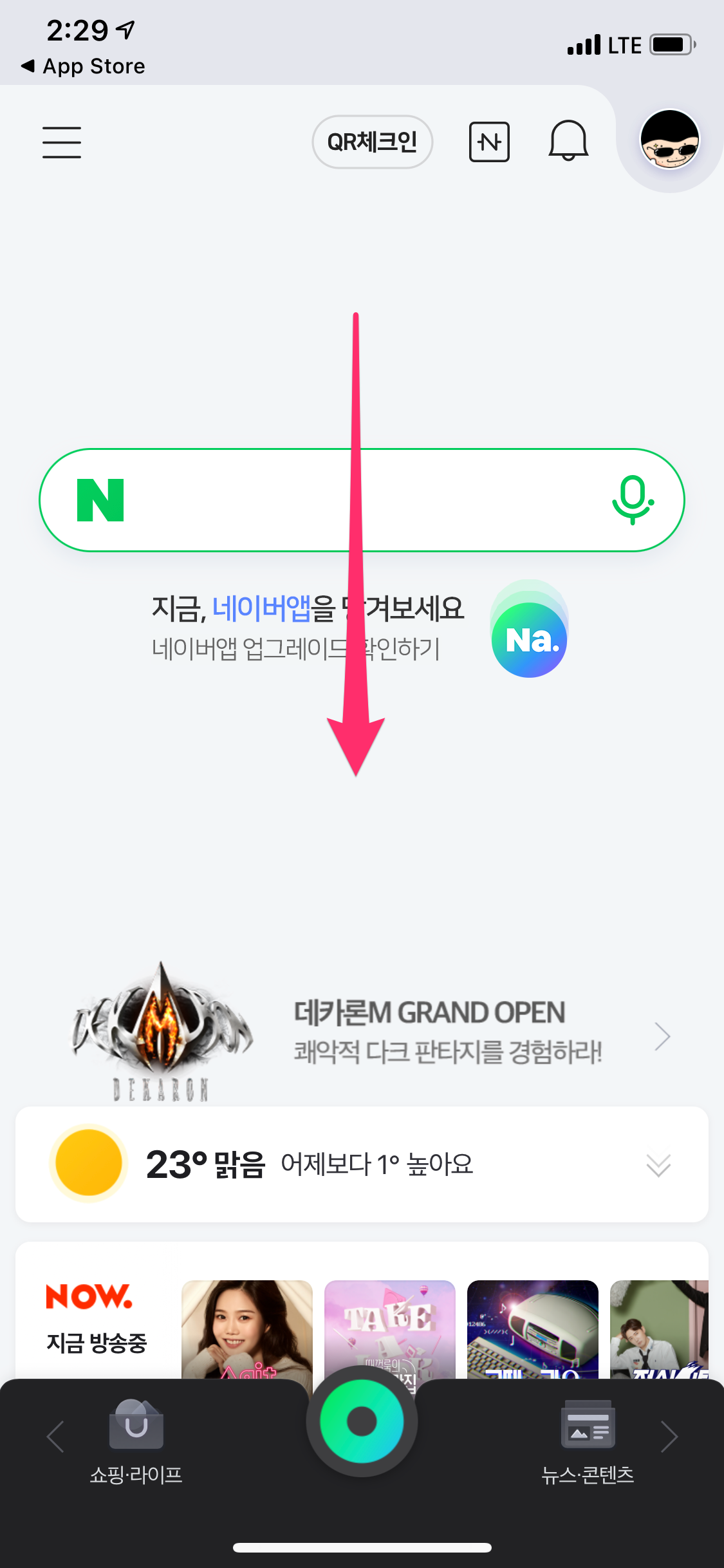 그리고 네이버 앱에서 손가락으로 위에서 아래로 당기거나 상단 오른쪽에 있는 프로필 사진을 선택합니다.