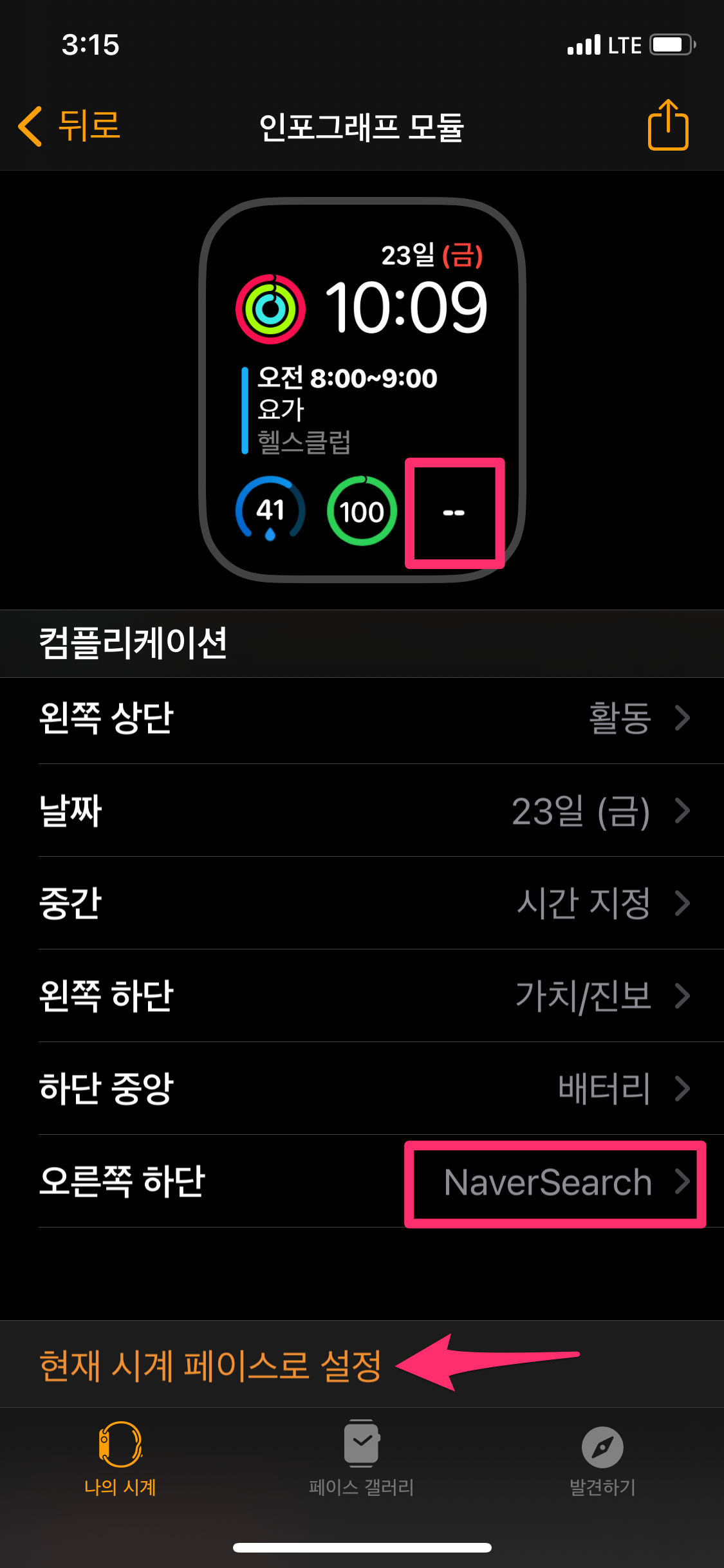 그러면 애플워치 화면에 오른쪽 하단은 NaverSearch로 변경된 것을 확인하고 현재 시계 페이스로 설정을 선택합니다.