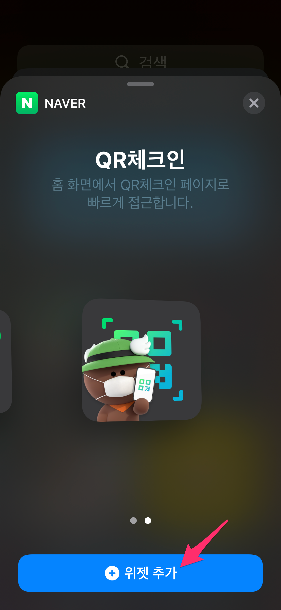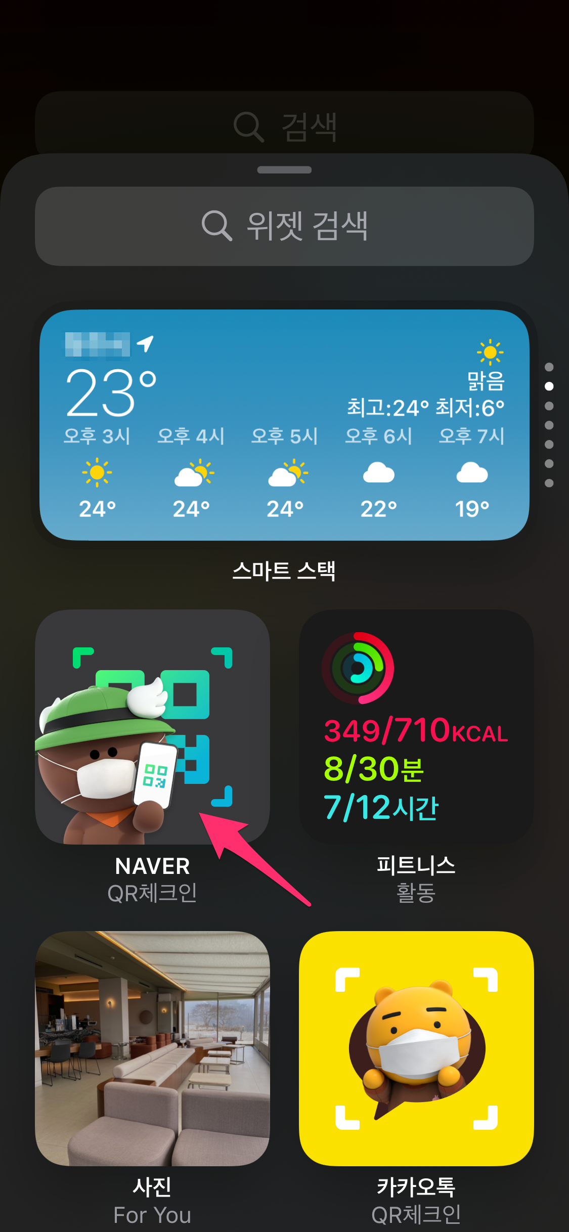 상단에 + 버튼을 선택한 후에 위젯 목록 중에서 NAVER QR 체크인을 선택합니다.
