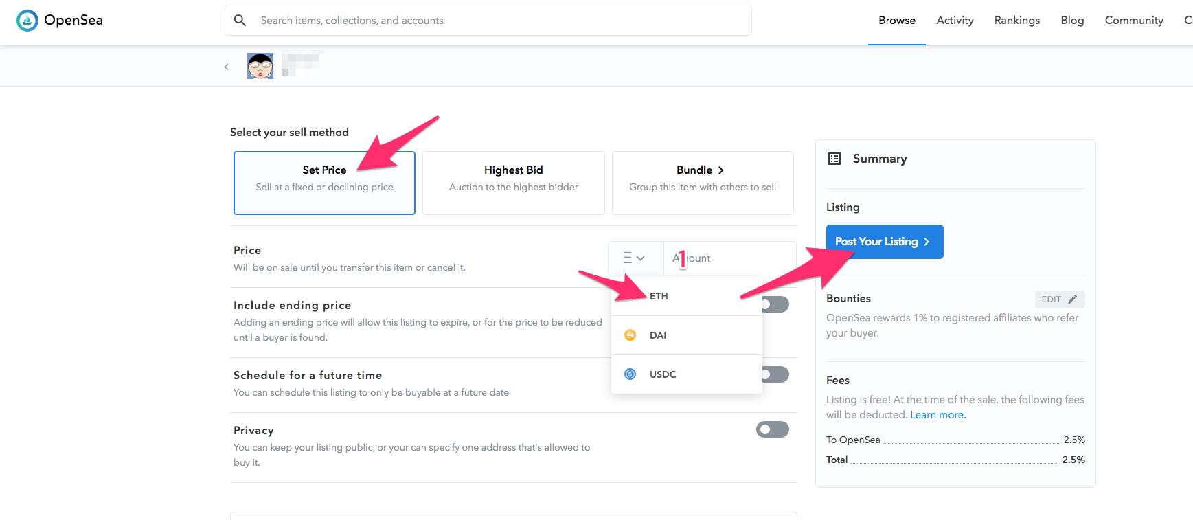 저는 Set Price를 선택한 후에 가격은 이더리움(ETH)으로 하고 오른쪽에 있는 Post Your Listing 버튼을 선택합니다.