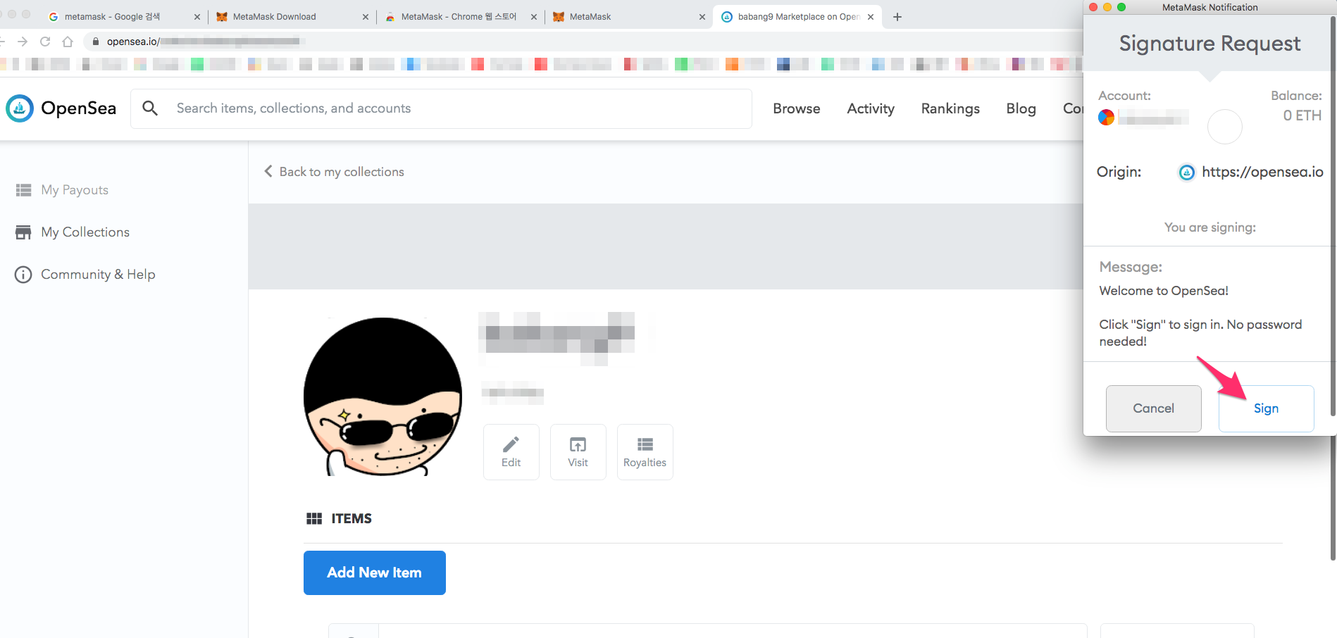 이제 세계 최대 NFT 마켓인 opensea에 접속하여 가입하고 작품을 팔아보겠습니다.