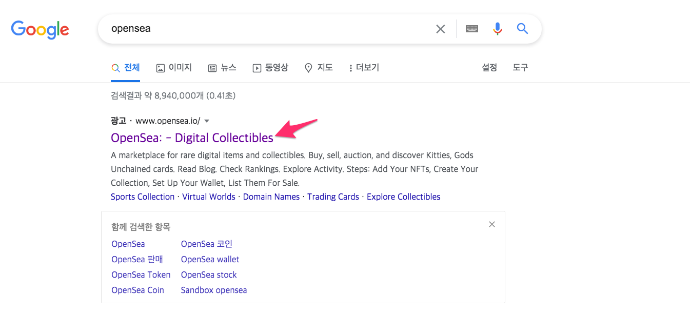 opensea 라는 검색어로 검색하신 후에 OpenSea 사이트에 접속합니다.