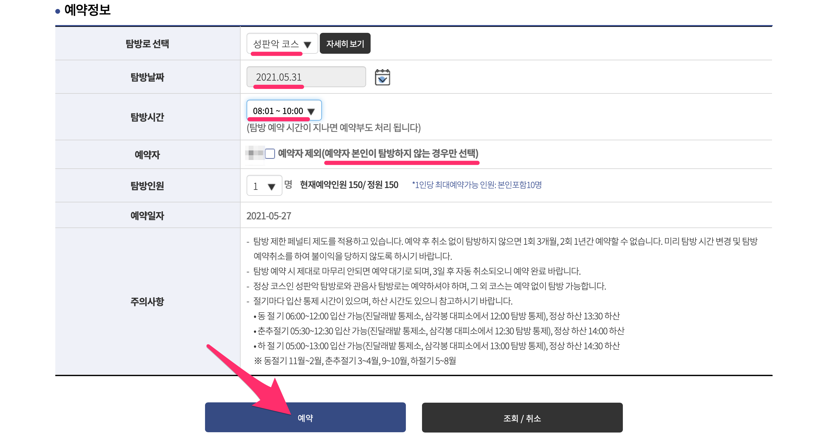 예약자에는 본인 이름이 있고 혹시나 예약자 본인이 탐방하지 않는 경우에는 예약자 제외를 체크합니다.
