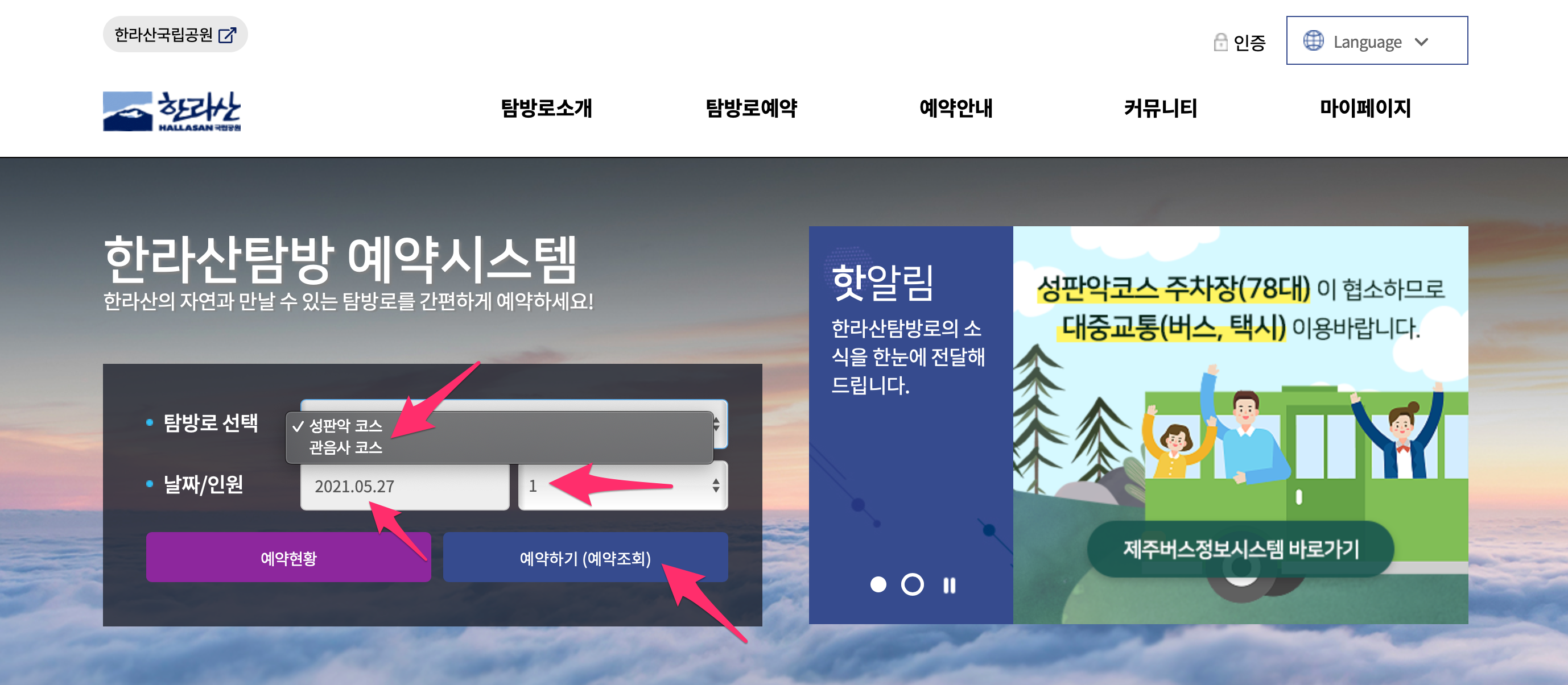 인터넷에서 한라산 탐방 예약 시스템으로 검색하신 후에 예약 홈페이지로 접속하시면 위와 같은 사이트에 접속됩니다.