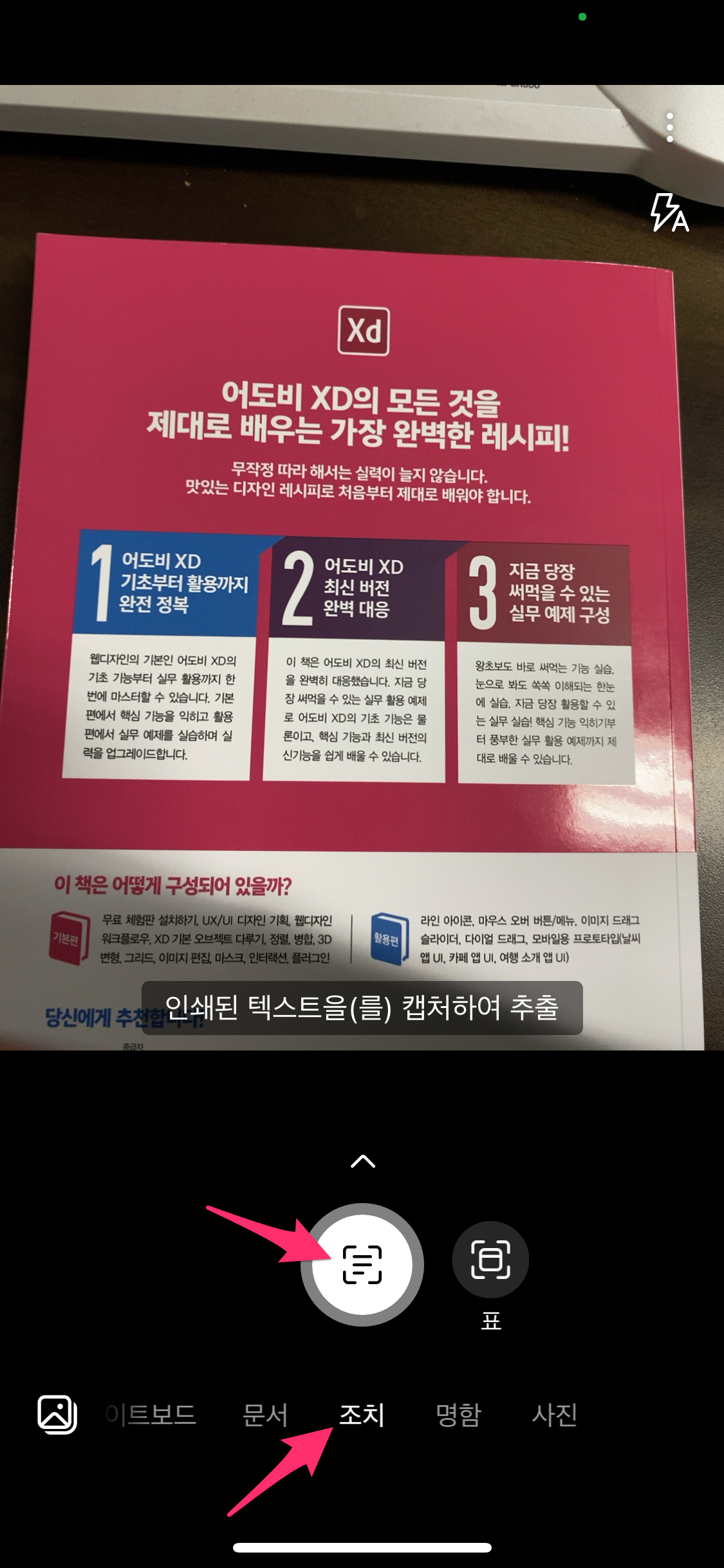 문서 촬영모드를 선택한 후에 문서를 촬영하면 텍스트를 인식하여 복사 및 공유할 수 있습니다.