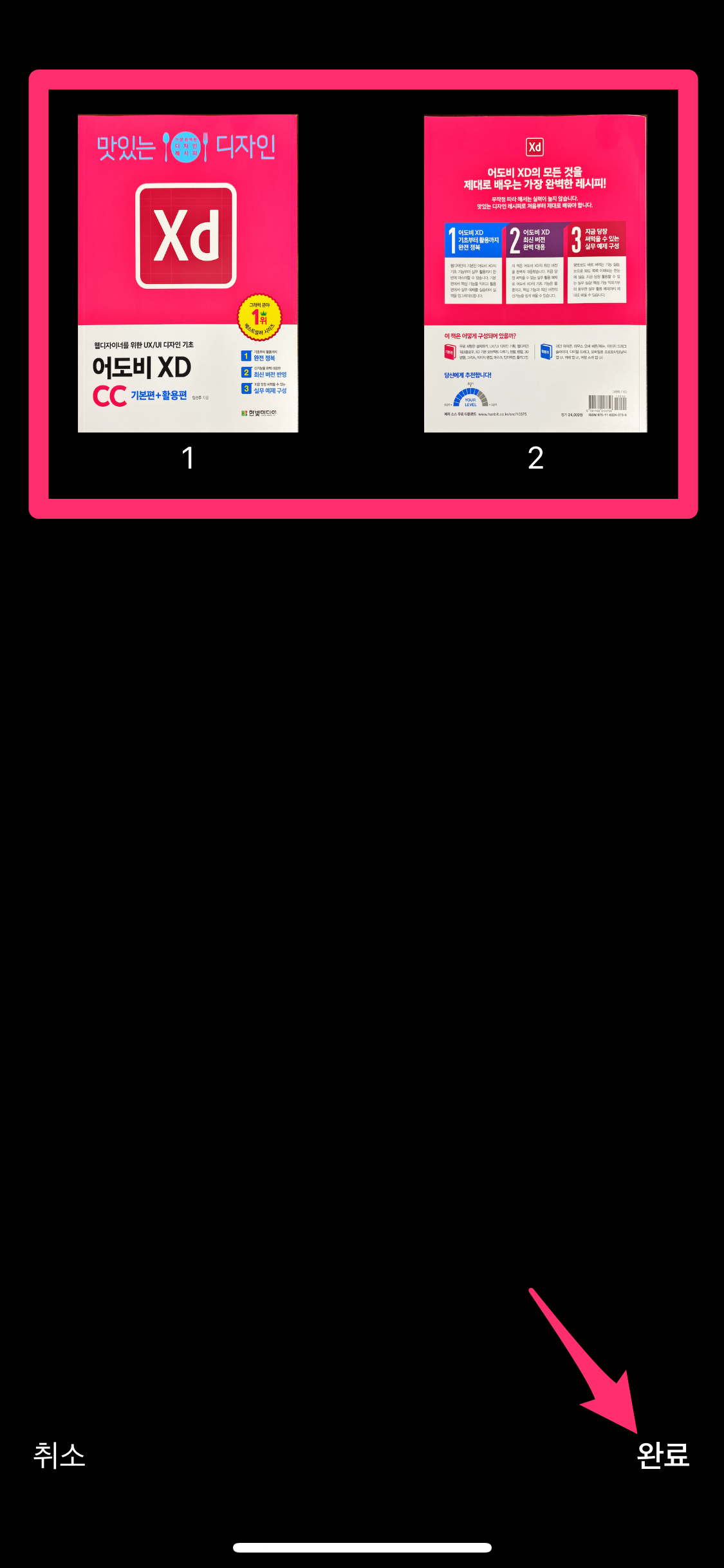 2번째 문서를 촬영을 마치면 촬영 숫자는 2가 됩니다. 이제 옆에 있는 주황색 원형 버튼을 선택합니다.