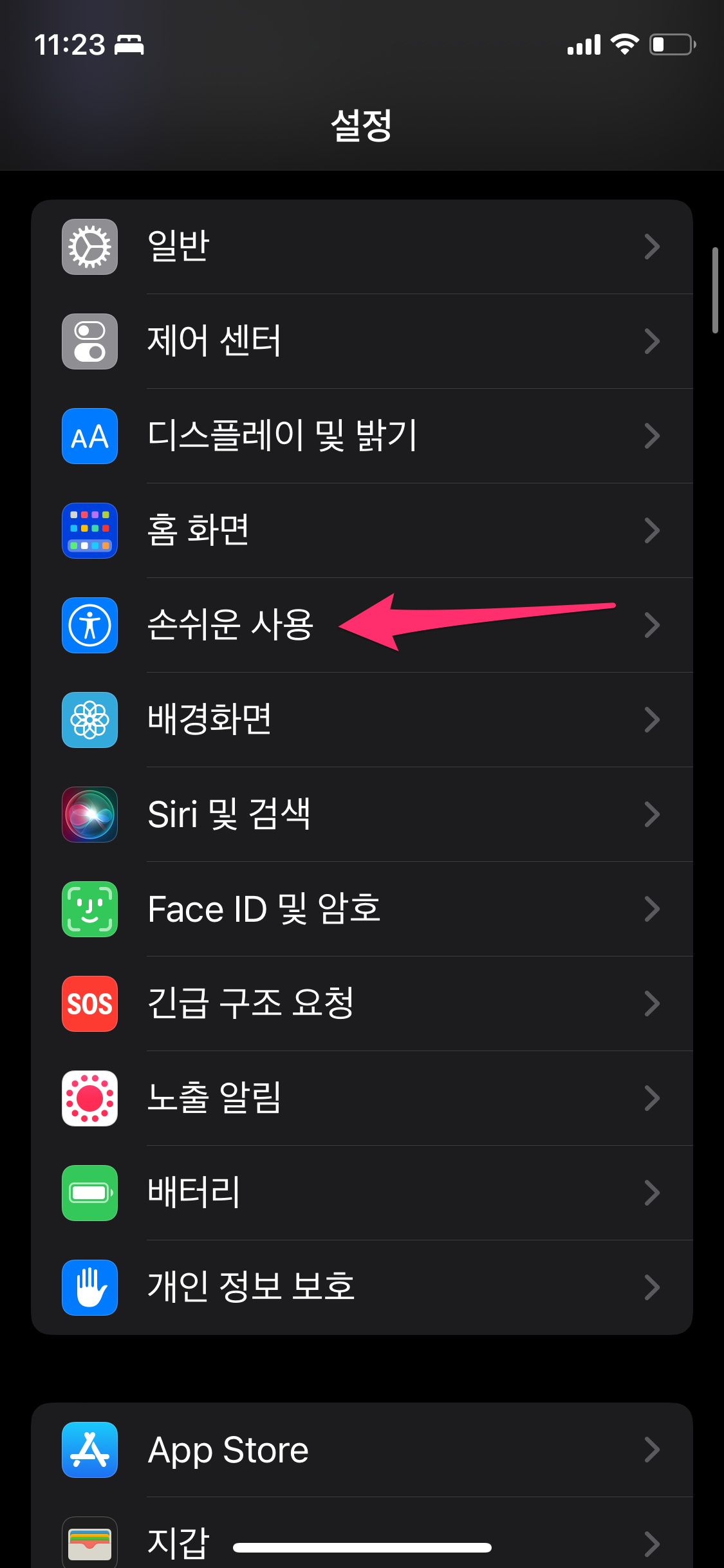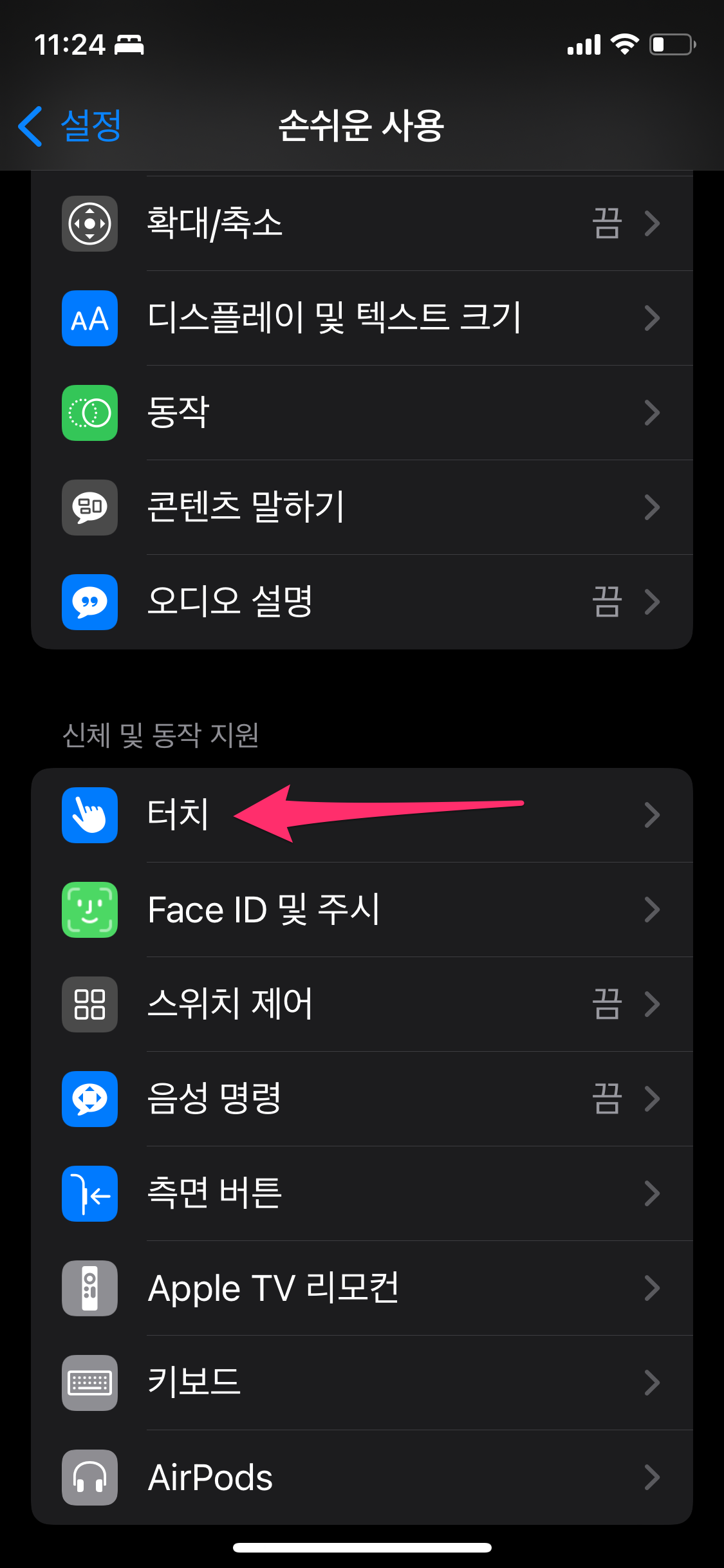 설정으로 들어가서 손쉬운 사용을 선택합니다.