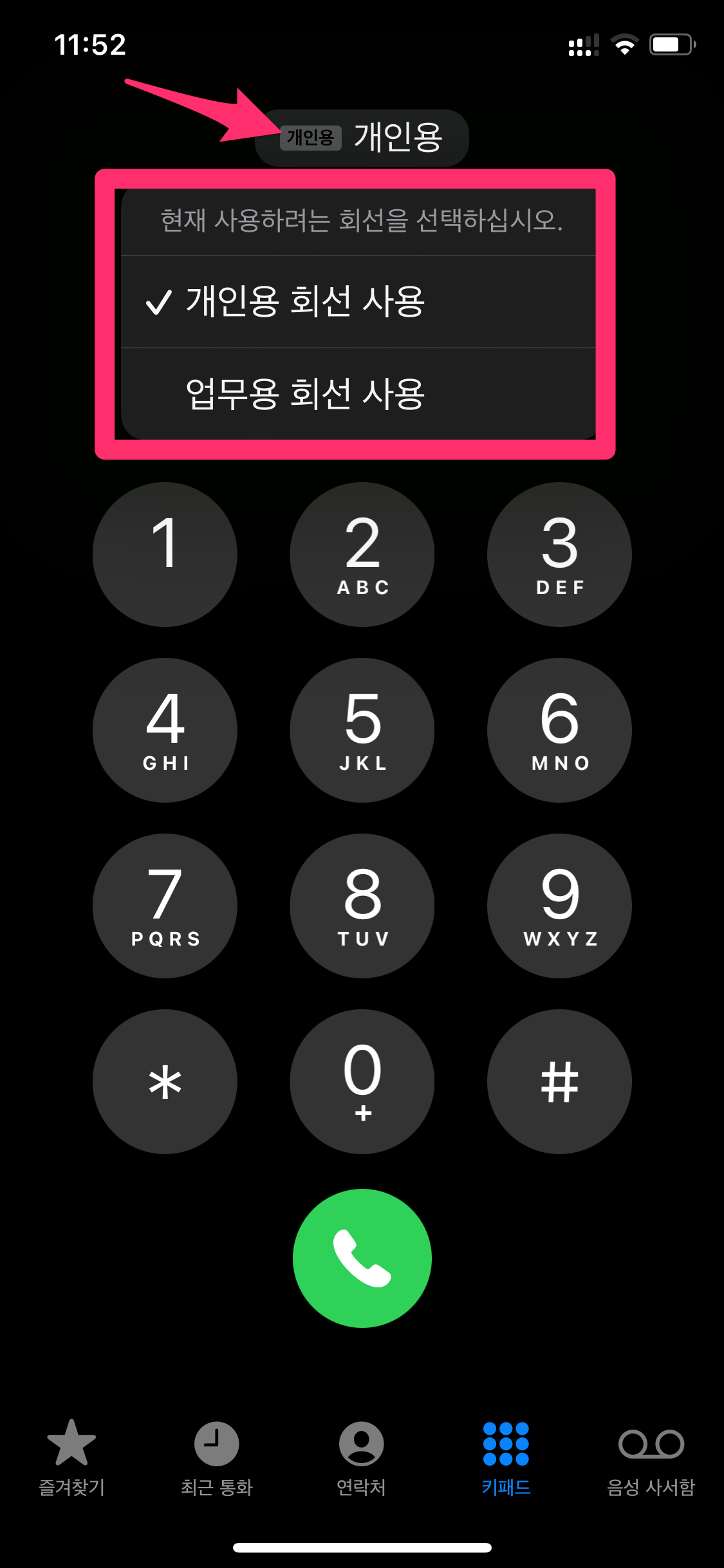 통화에서 키패드 상단에 있는 셀룰러 레이블을 선택하시면 기준 번호의 레이블과 방금 전에 추가한 레이블이 보입니다.