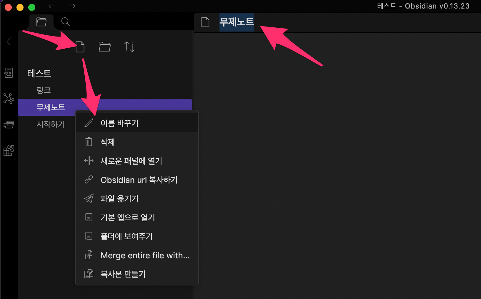 상단 파일 편집기에서 노트 아이콘을 선택하면 '무제노트'라는 이름의 노트가 생성됩니다.