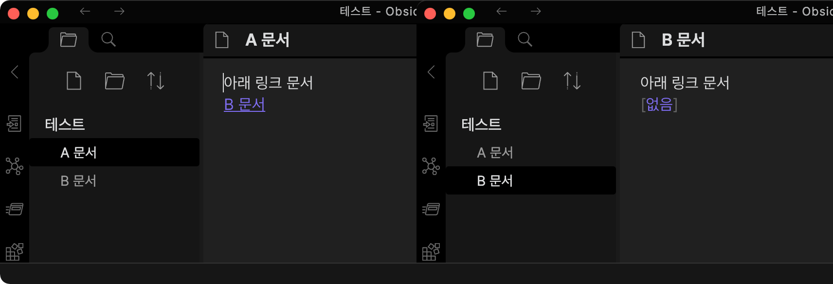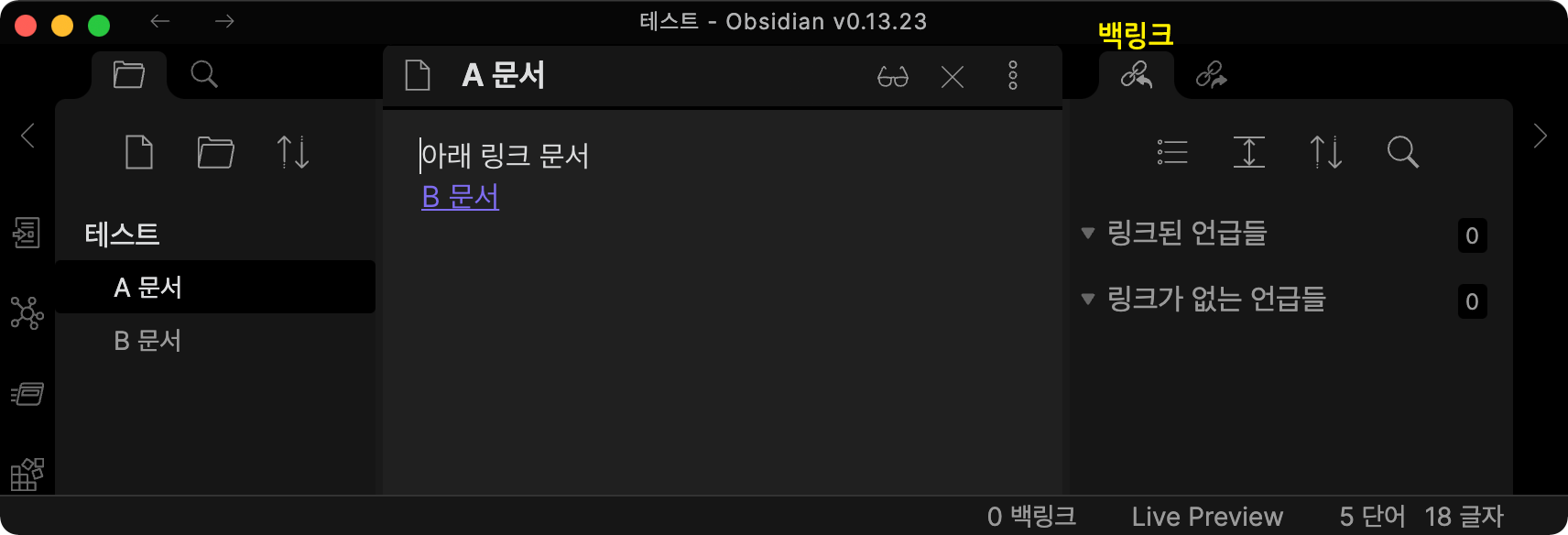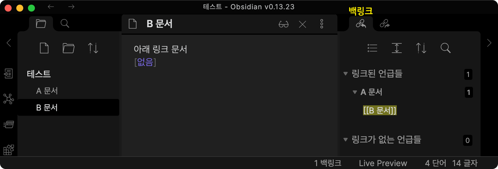 B 문서에는 아무런 링크가 없지만 B 문서 링크가 있는 A 문서가 백링크 창에 보여집니다.