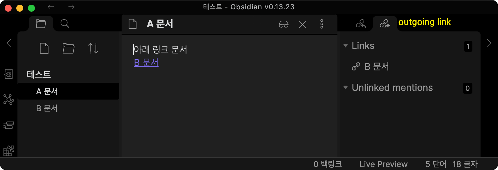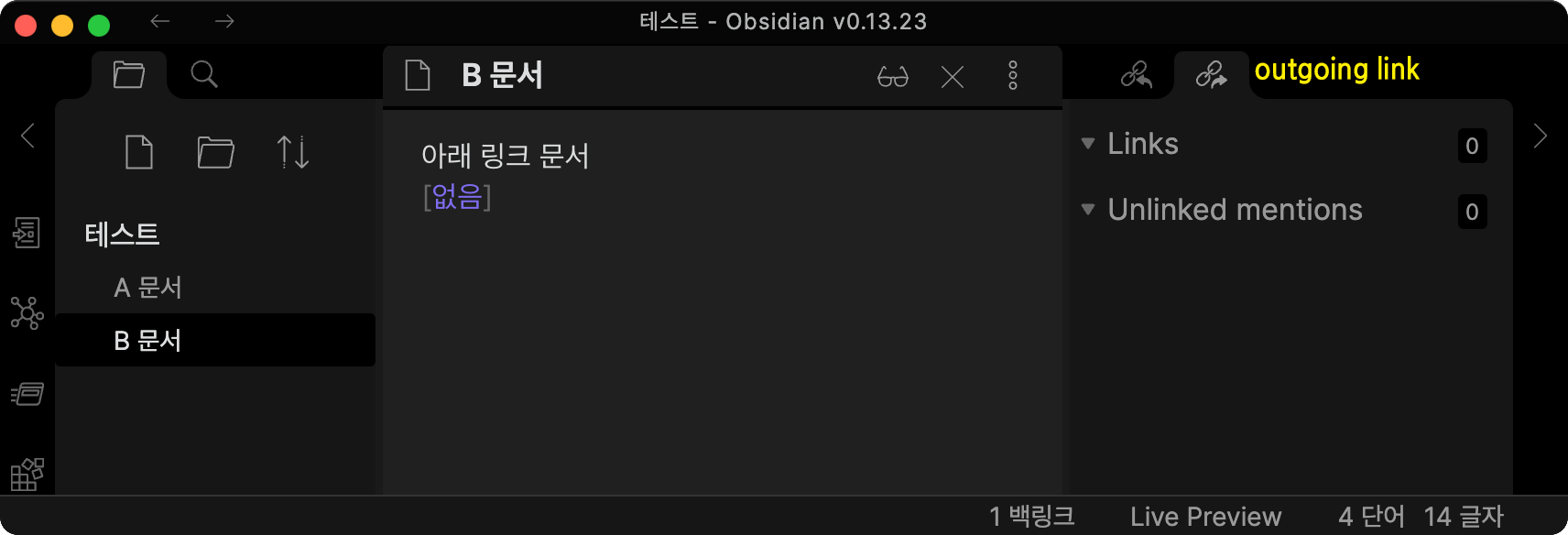 B 문서에는 연결된 링크가 없기에 outgoing link 창에 아무런 표시가 없습니다..