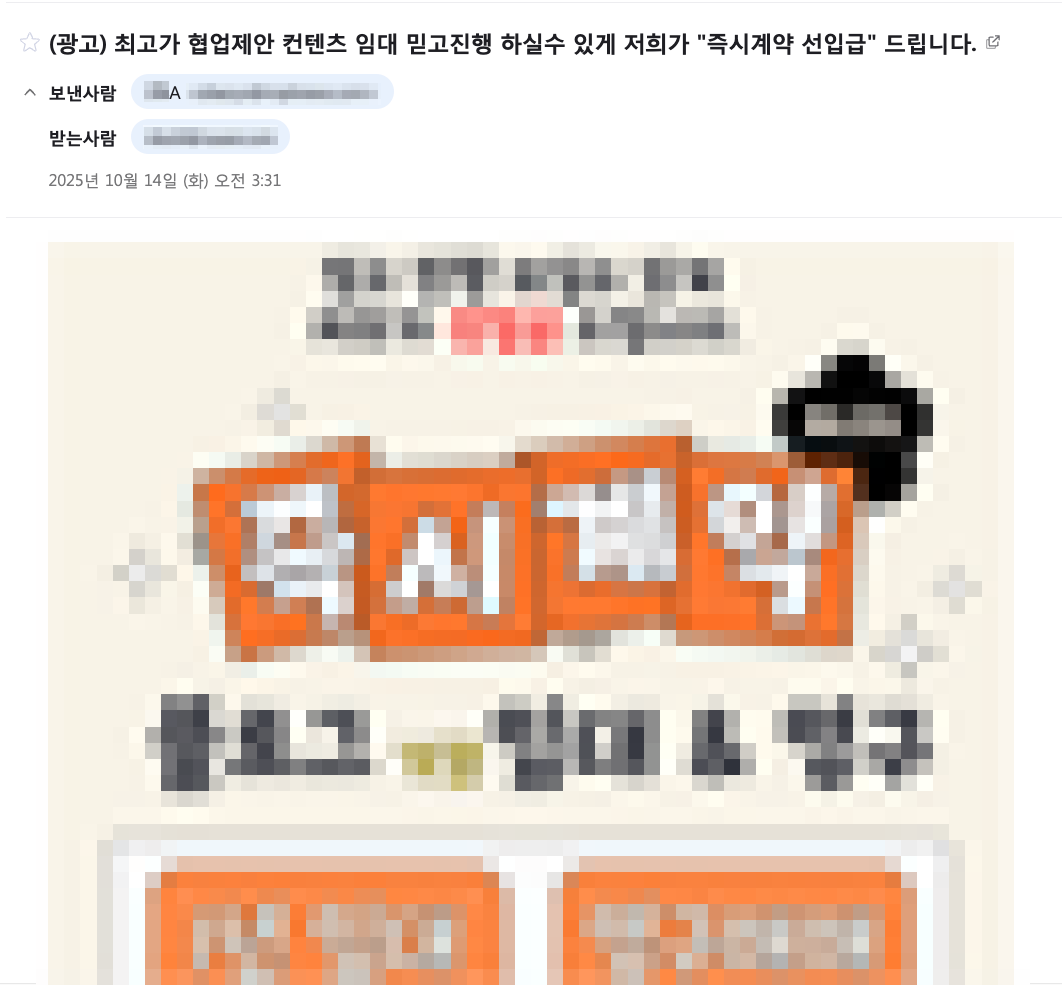 다만 메일 주소, 채팅방, 금액, 마케팅 문구가 모두 동일한 패턴을 보이는 점은 조금 의아합니다.