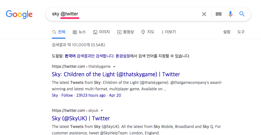 쇼셜미디어(twitter, facebook 등) 중에 트위터에서 sky를 검색합니다.
