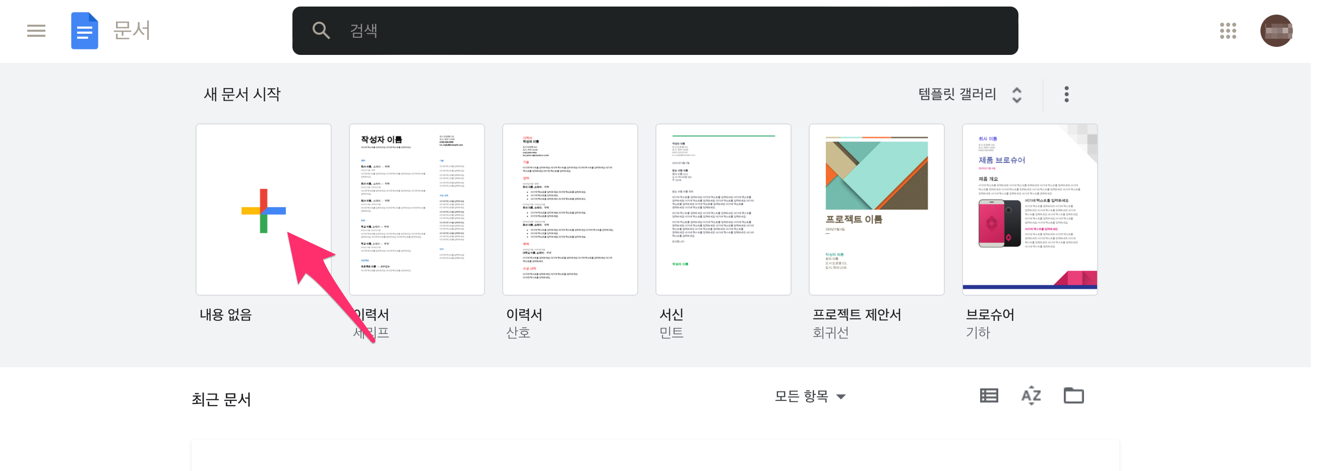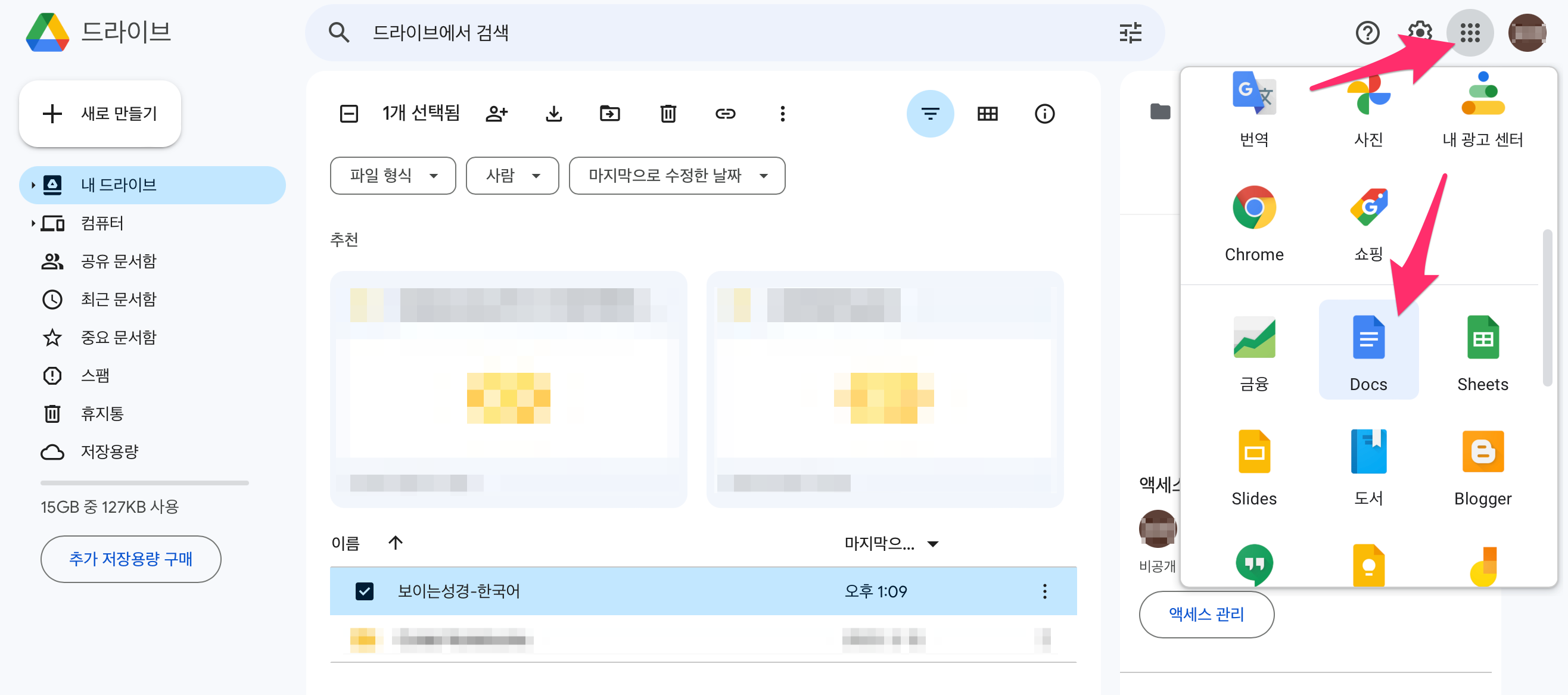 오른쪽 상단 구글 앱을 선택하고 Docs를 선택합니다.