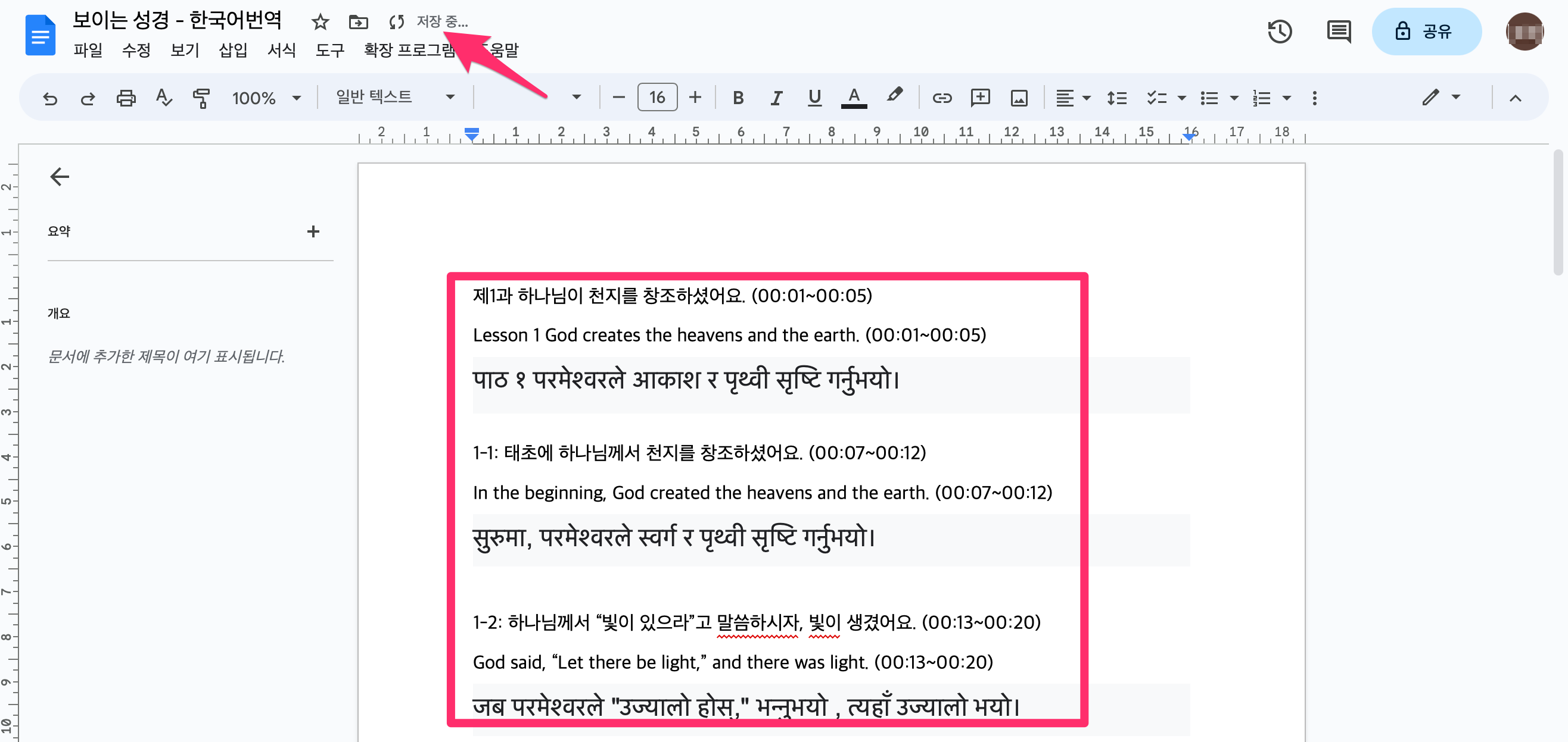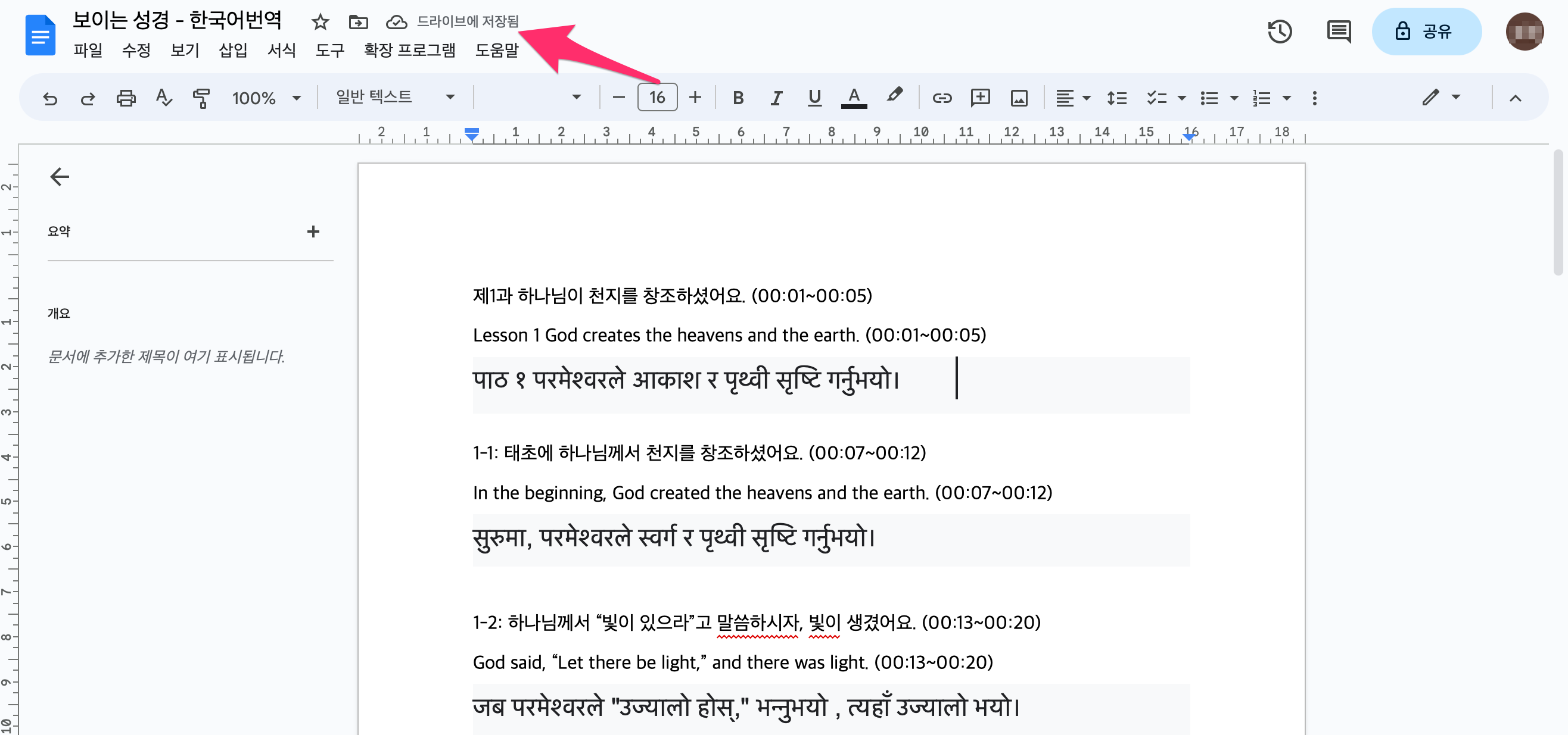 특히, 다국어 작업을 공유할 때 워드나 한글문서보다는 웹에서 작성한 구글 문서로 사용하게 되면 좀 더 안정적 작업을 할 수 있습니다.