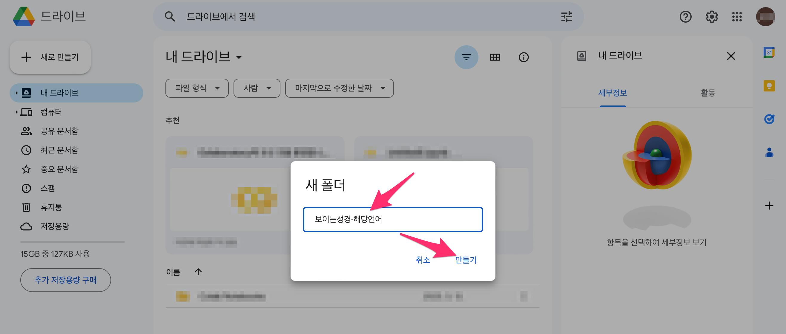 폴더명을 작성하고 만들기 버튼을 선택합니다.