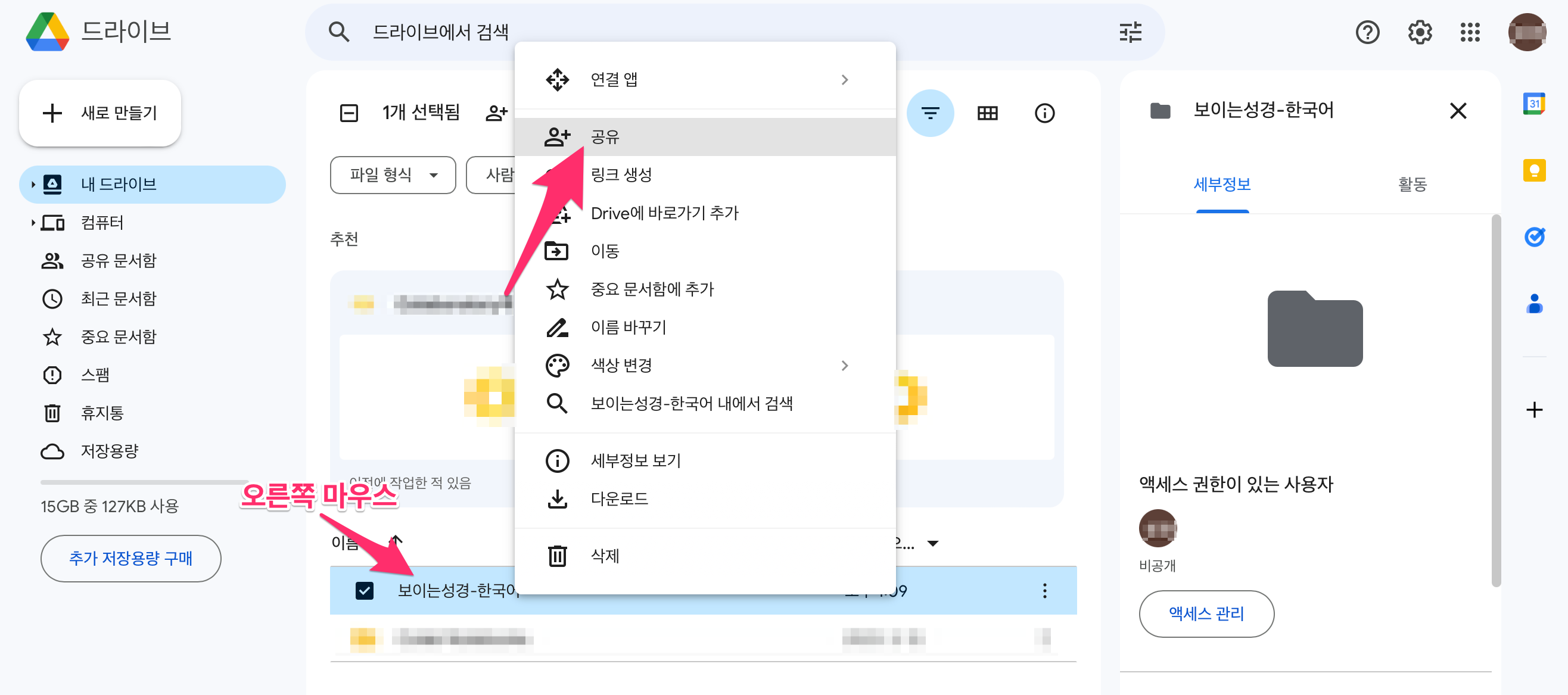 제작된 폴더를 마우스 오른쪽 클릭을 한 후에 공유를 선택합니다.