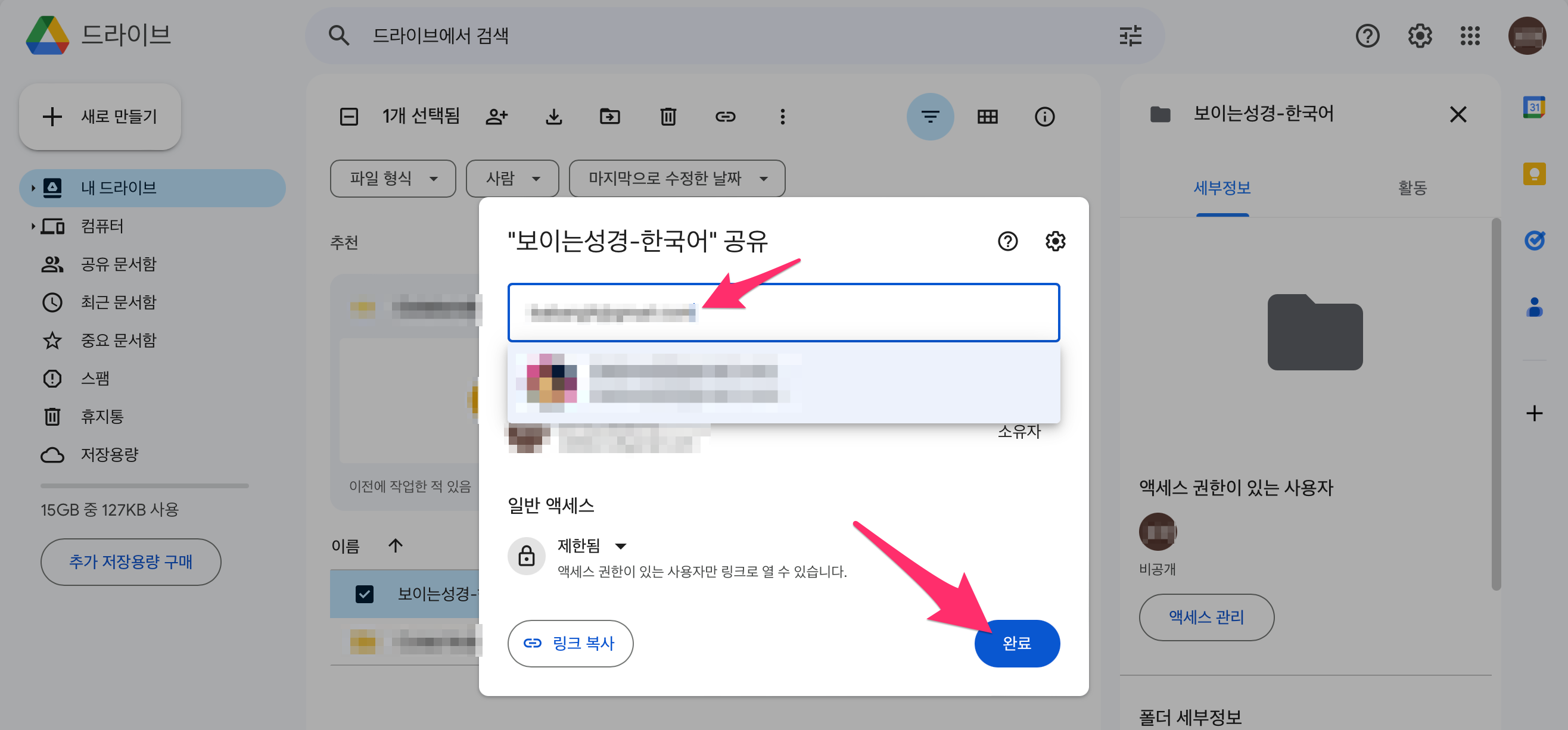 공유할 메일을 작성한 후에 완료 버튼을 선택합니다.