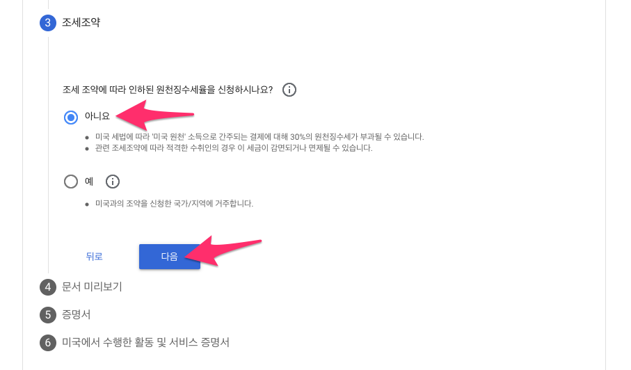 조세조약에서는 저는 미국에 살지 않는 개인이기에 아니요를 선택합니다.