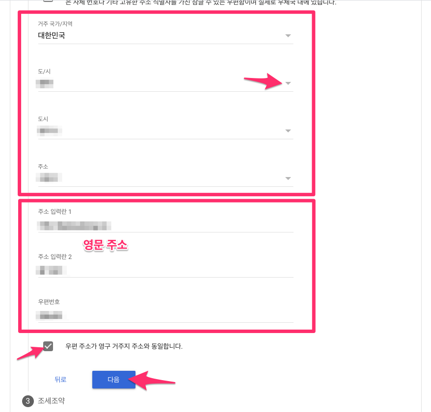 그리고 우편 주소가 영구 거주지 주소와 동일하면 체크하시고 다르면 우편 주소를 입력하면 됩니다.