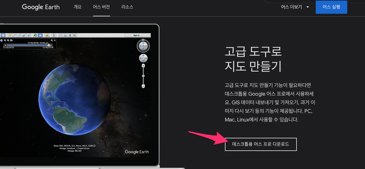 홈페이지 맨 밑으로 내려가보시면 데스크톱용 어스 프로 다운로드를 클릭합니다.