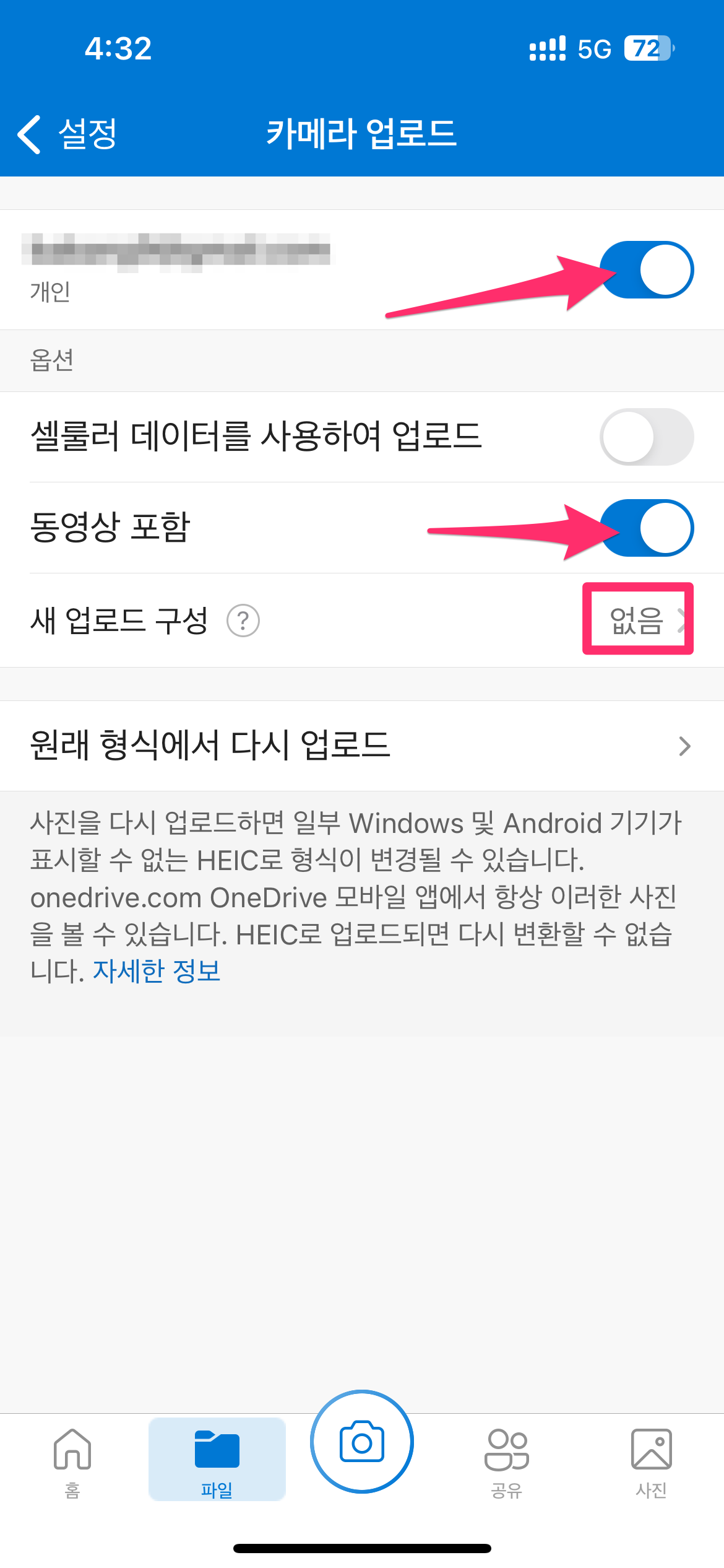 카메라 업로드에서 체크된 것을 확인합니다.