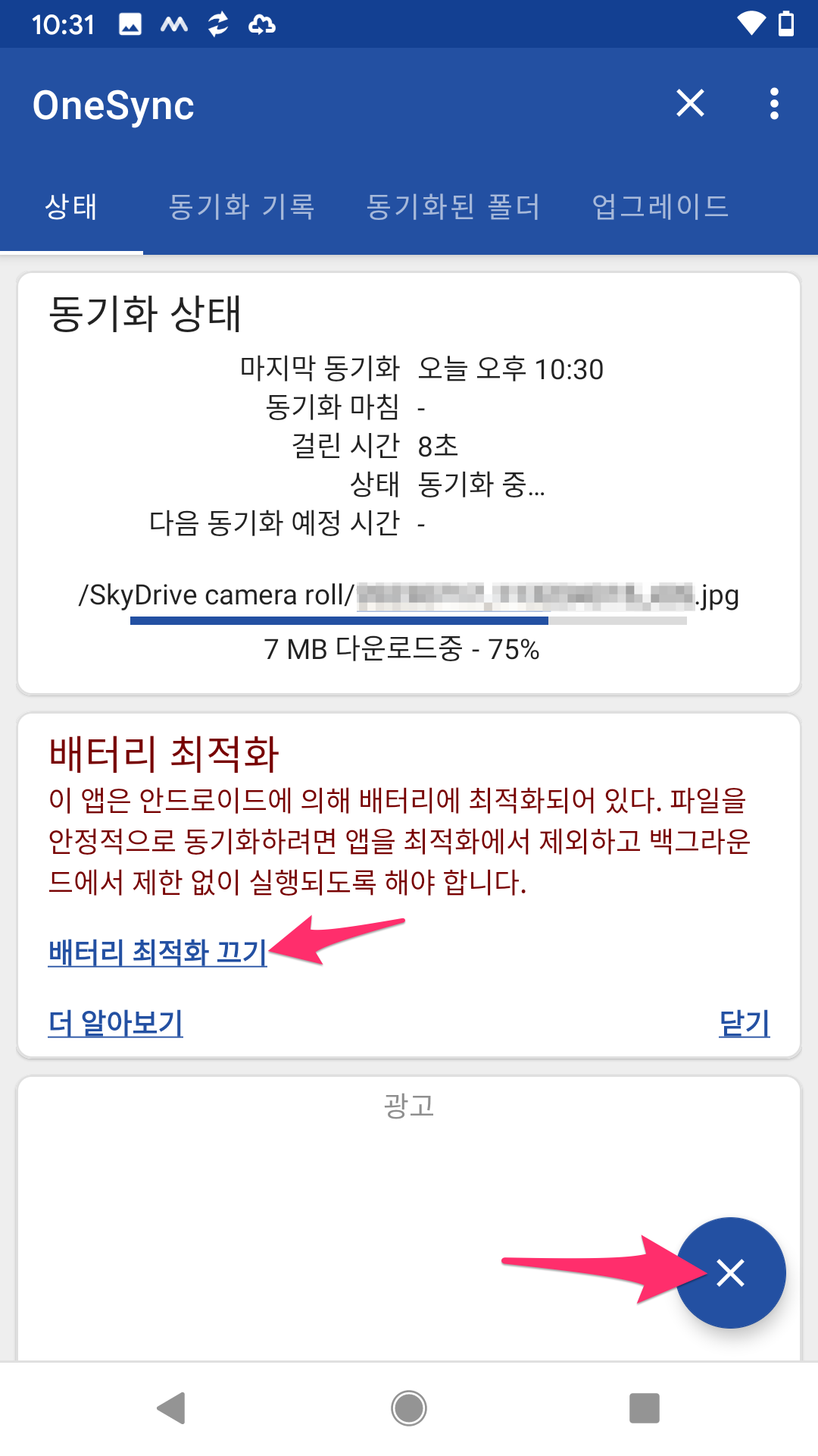 하지만, 혹시 업로드할 사진이 많다면 OneSync 앱에서 배터리 최적화 끄기를 선택하고 MacroDroid 앱을 설치해야 합니다.