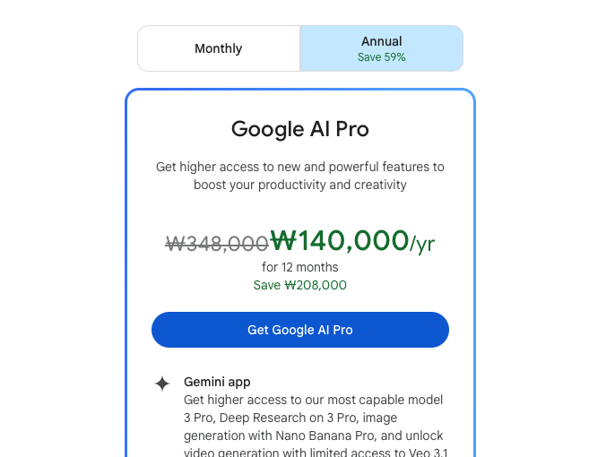 정가 월 29,000원인 구글 AI Pro를 최대 1년간 59% 할인된 140,000원(1년 결제/월 11,600원)에 이용할 수 있는 절호의 기회입니다.