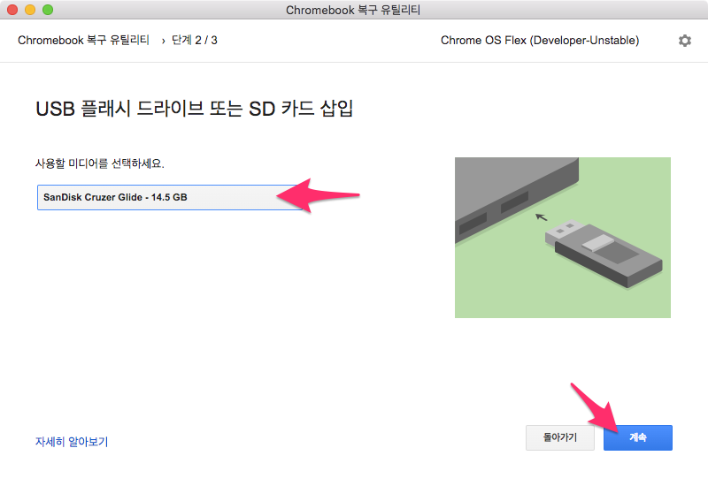 사용할 미디어를 선택하면 처음에 연결된 USB 메모리를 선택하고 계속 버튼을 선택합니다.