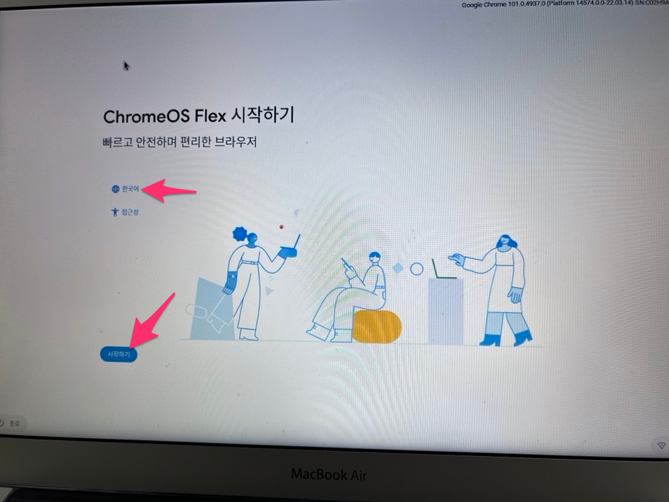 부팅이 되면서 좀 기다리면 ChromeOS Flex 시작하기 화면이 나옵니다.
