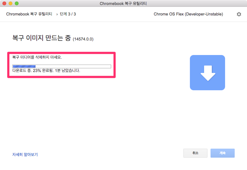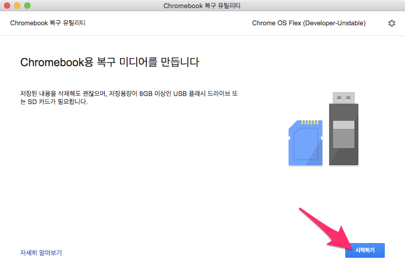 오른쪽 하단에 ChromeOS Flex 설치 버튼을 선택하면 팝업창이 나옵니다.