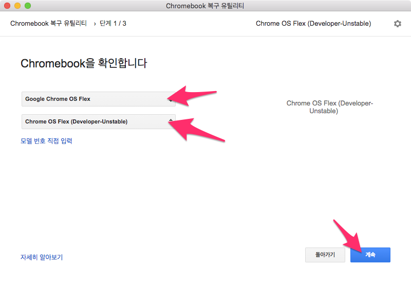 제조업체는 Google chrome OS Flex, 제품 선택은 Chrome OS Flex (Developer-Unstable)를 선택합니다.