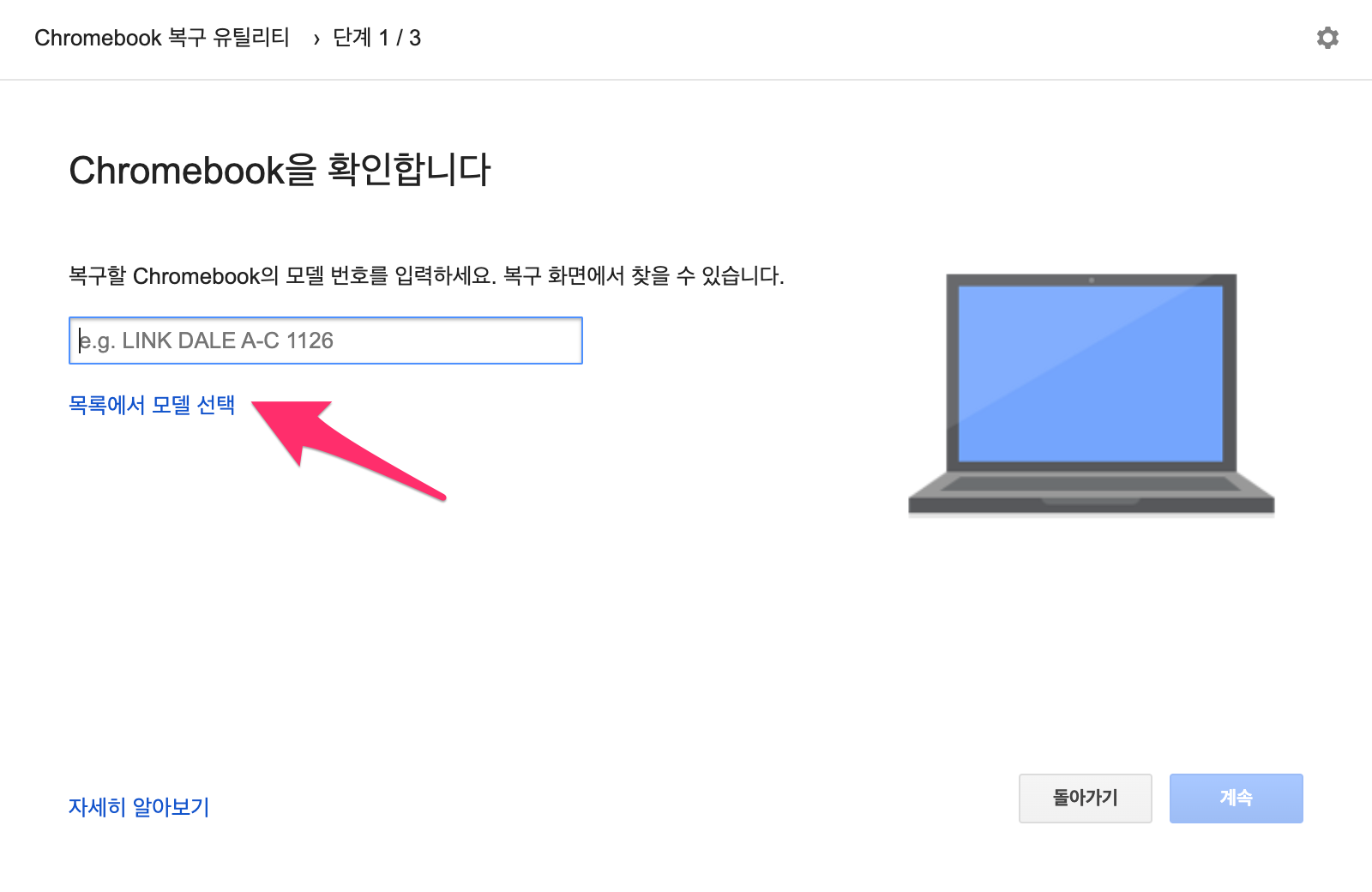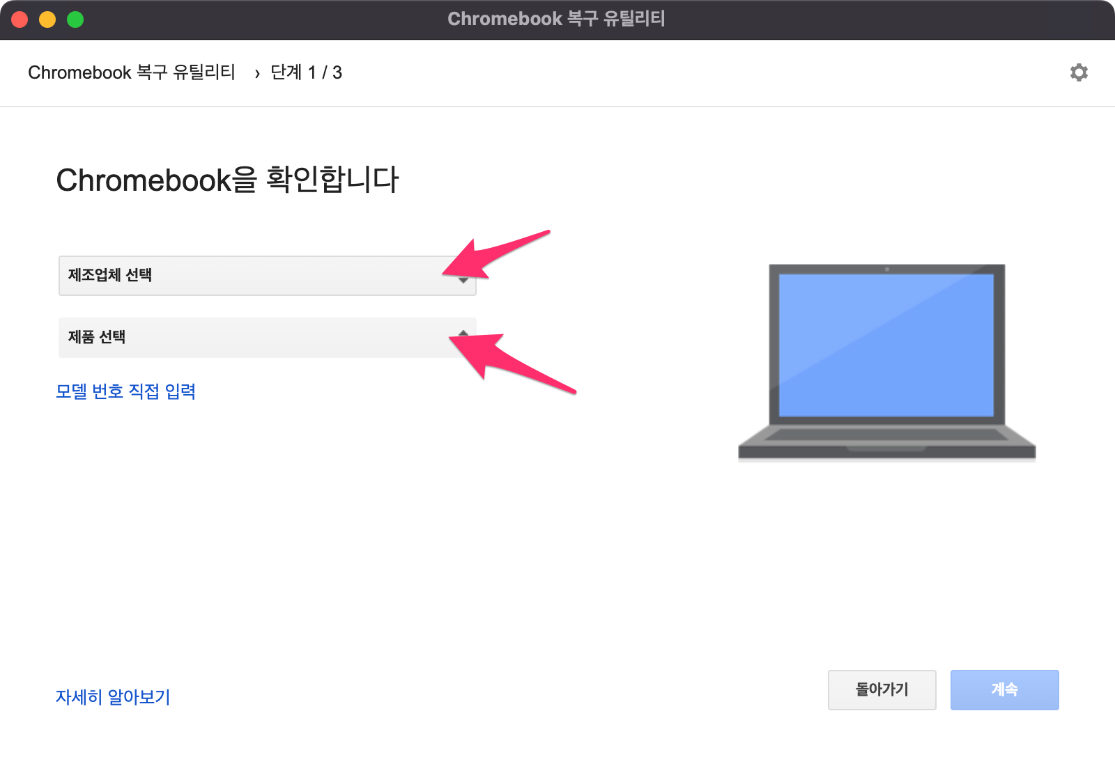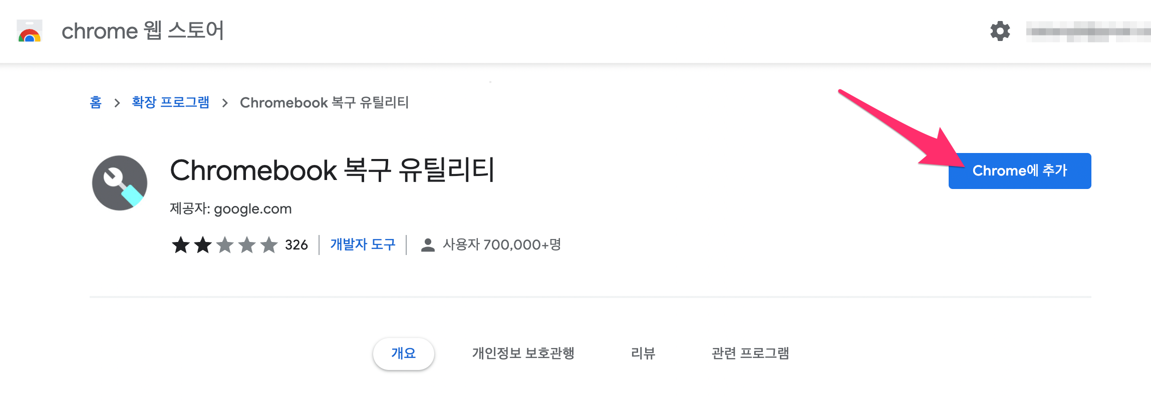 크롬 브라우저에서 웹스토어(https://chrome.google.com/webstore/)로 들어가신 후에 Chrombook 복구 유틸리티를 검색하여 설치합니다.