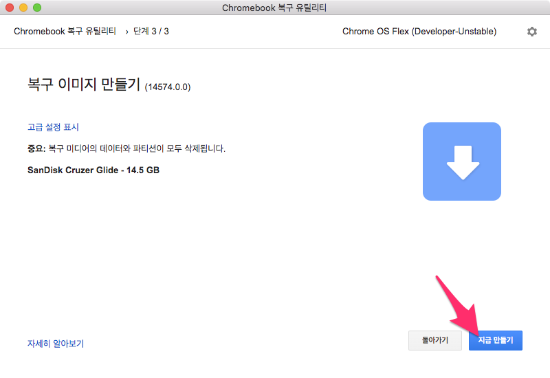 오른쪽 하단에 ChromeOS Flex 설치 버튼을 선택하면 팝업창이 나옵니다.