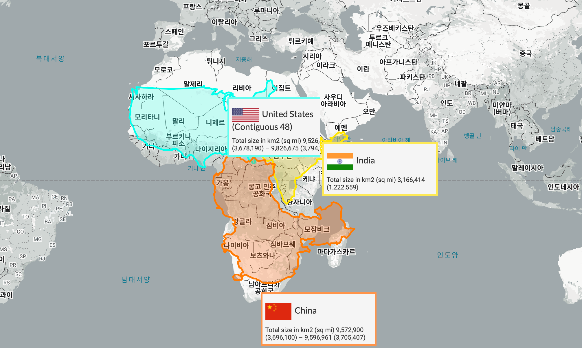 재밌는 건 미국, 중국, 인도를 다 합쳐도 아프리카 대륙이 더 크네요 ㅎㅎㅎ