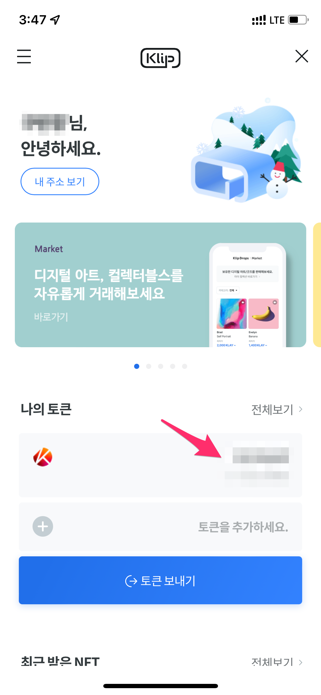 Kaikas 지갑이 만들어지면 아까 카카오톡에서 만든 클립(Klip)에서 클레이 토큰을 방금 만든 Kaikas 지갑으로 보내면 됩니다.
